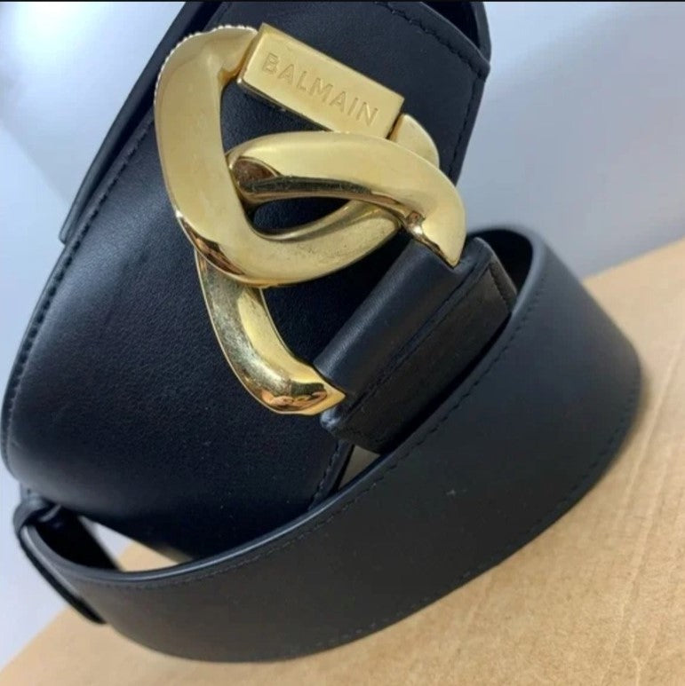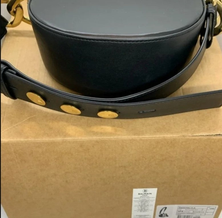 Grained calfskin shoulder bag in black. Adjustable leather shoulder strap with post-stud fastening. Logo hardware at face. Patch pocket at back face. Foldover flap with magnetic fastening. Leather card slot at interior. Suede lining in off-white. Gold-tone hardware. Approx. Measurements: 7 length x 6 height x 3 width. color: Black Comes with all original purchasing documentation