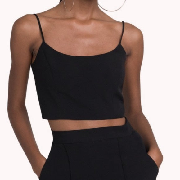 Black Halo Trish 2pc Jumpsuit DESCRIPTION: Design details: two-piece design, spaghetti straps, seamed pant, and dual front angled pockets. Center back zipper closure. SIZE: 2 -Color/pattern: black -Shell: 88% polyamide, 12% elastane -Lining: 96% polyamide, 4% elastane -Dry clean only -Made in the USA