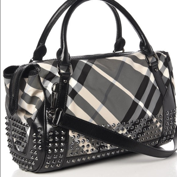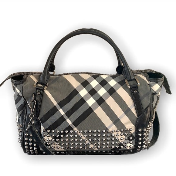 Authentic BURBERRY Nylon Beat Check Studded Medium Edenham Satchel. This medium-sized stylish handbag is crafted of classic Burberry grey check nylon. The bag features rolled leather shoulder straps with silver ring links, a based lined with dark silver cone studs. The top is open to a black fabric interior, ideal for everyday use, with the iconic style only from Burberry! CONDITION: Excellent DETAILS Length: 14.5 in Width: 6.5 in Height: 10.25 in Drop: 5 in Drop: 11.5 in Designer ID#: ITFLOPEL33CAME COMES WITH * Dust bag * Strap