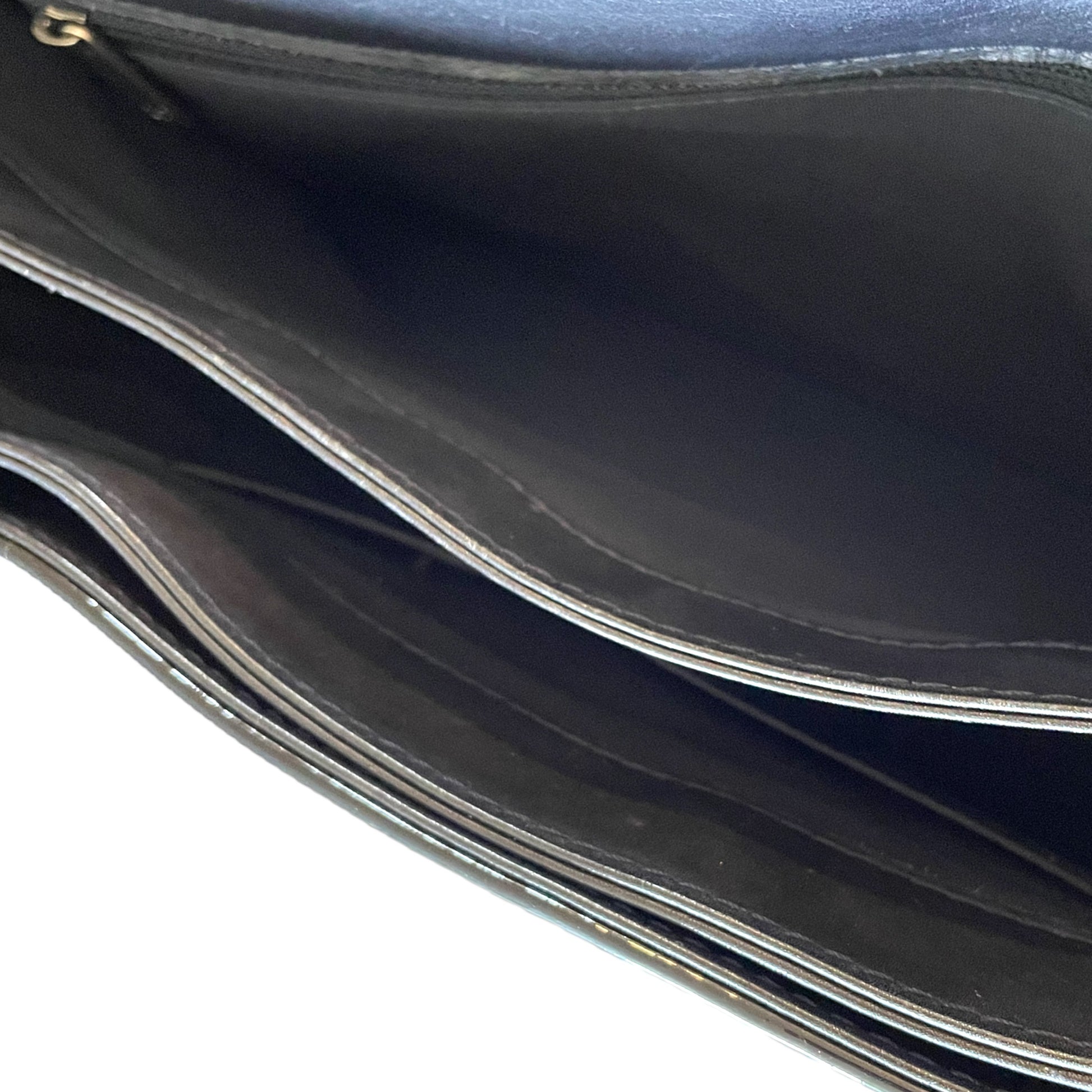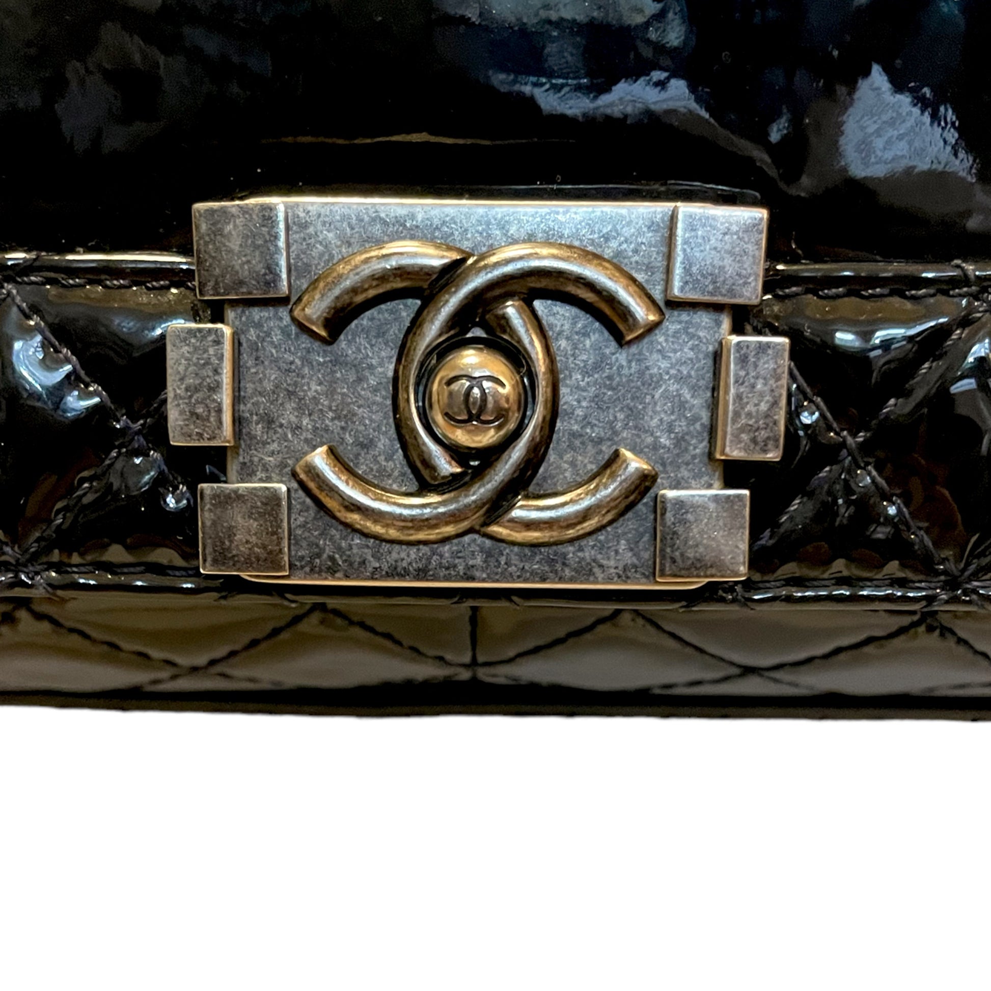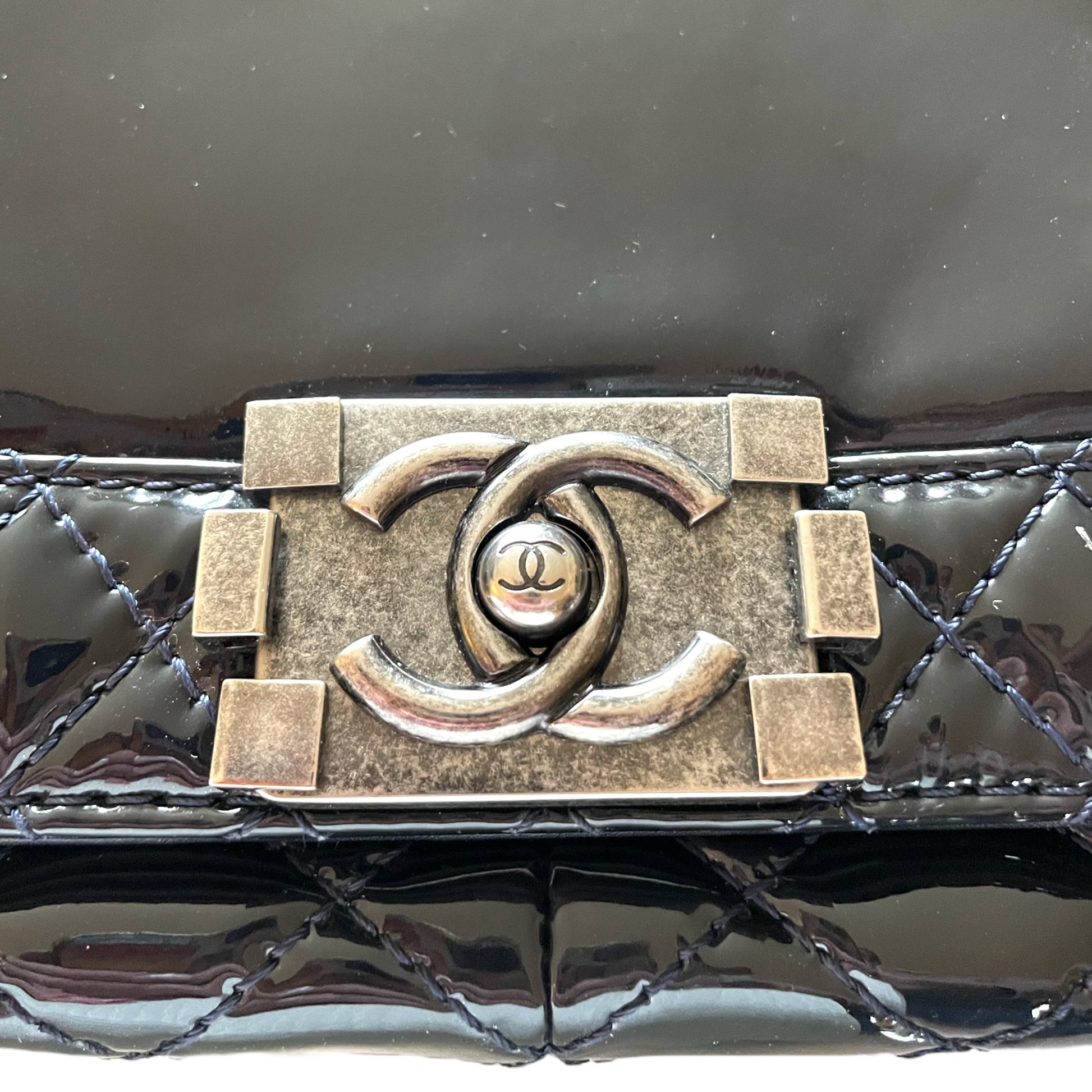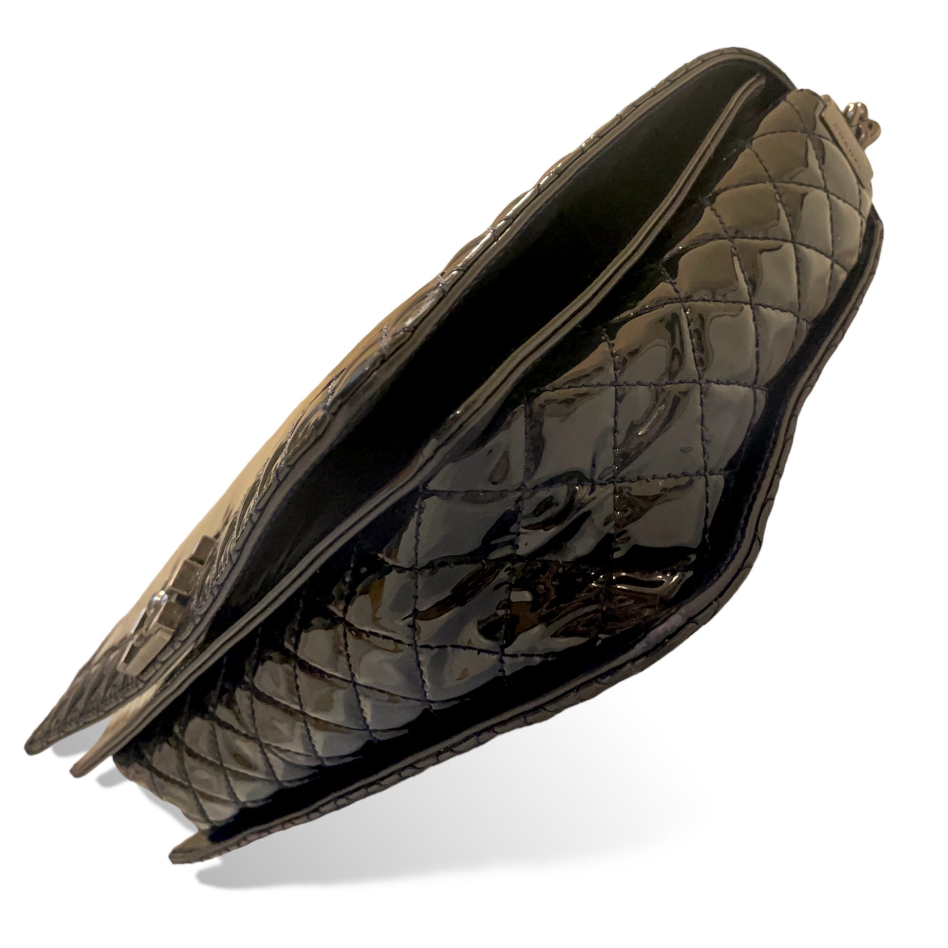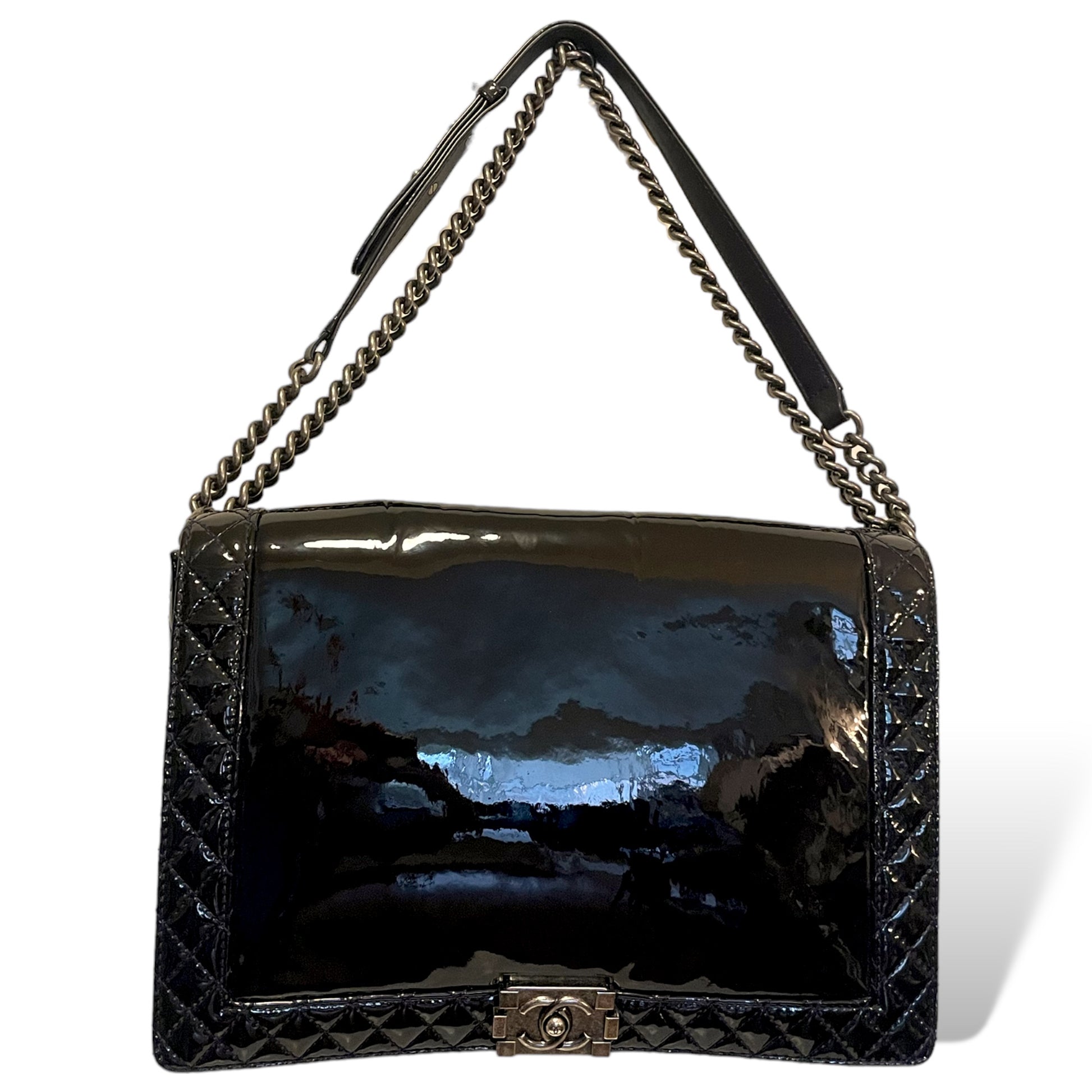 The Chanel Reverso Boy Flap Bag Patent/Lambskin Large features a sleek, rectangular shape and is crafted from high-quality, glossy patent leather in a rich midnight blue hue. The iconic Chanel Boy clasp is prominently displayed on the front flap, adding a touch of edgy refinement to the classic quilted trim design. The bag can be worn cross-body or on the shoulder with its adjustable leather and chain strap.