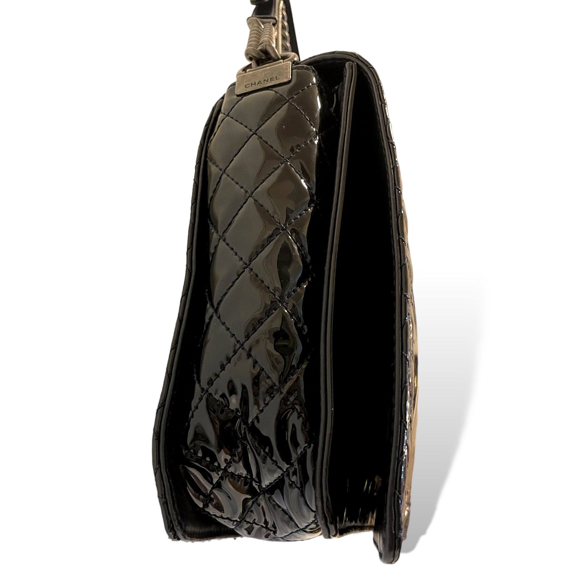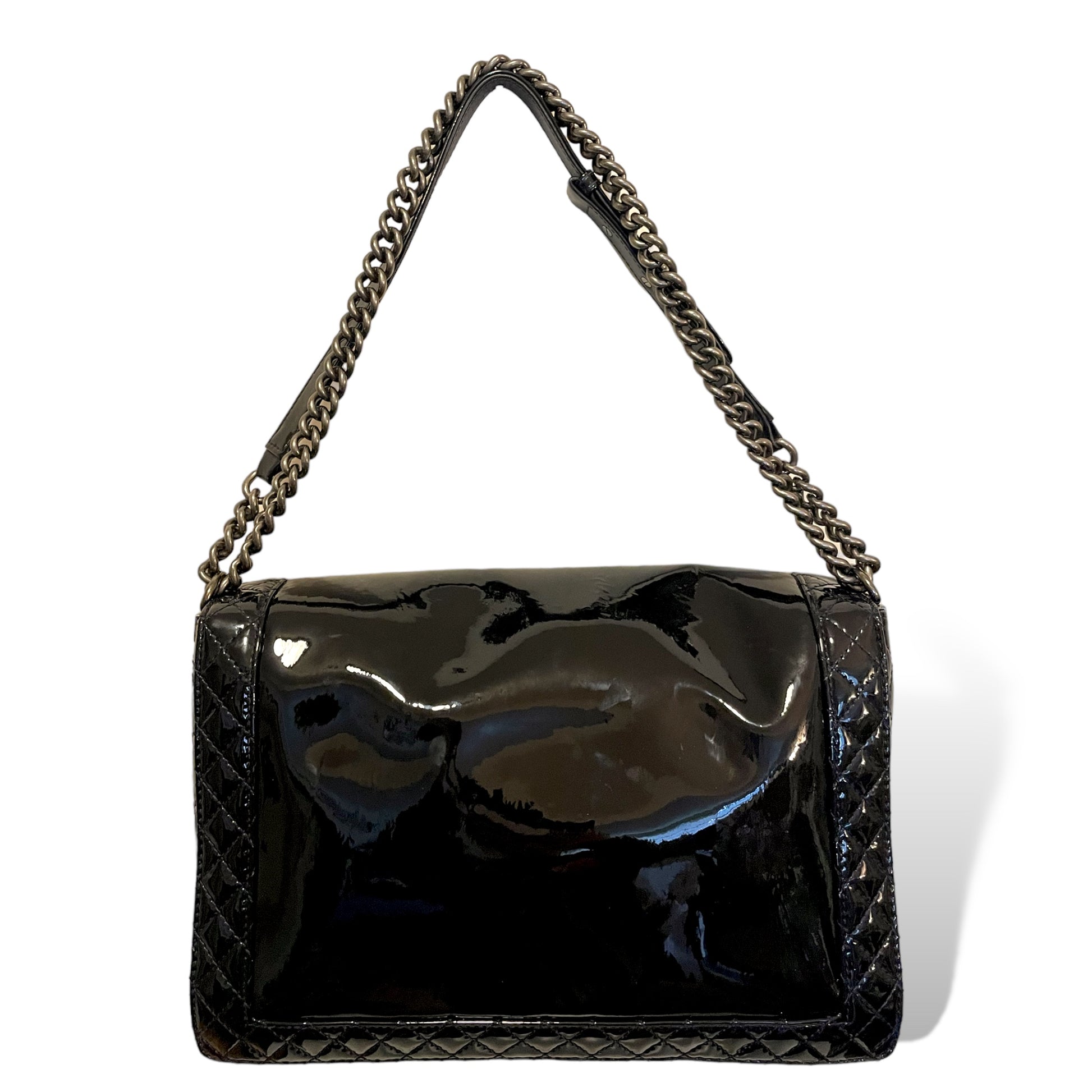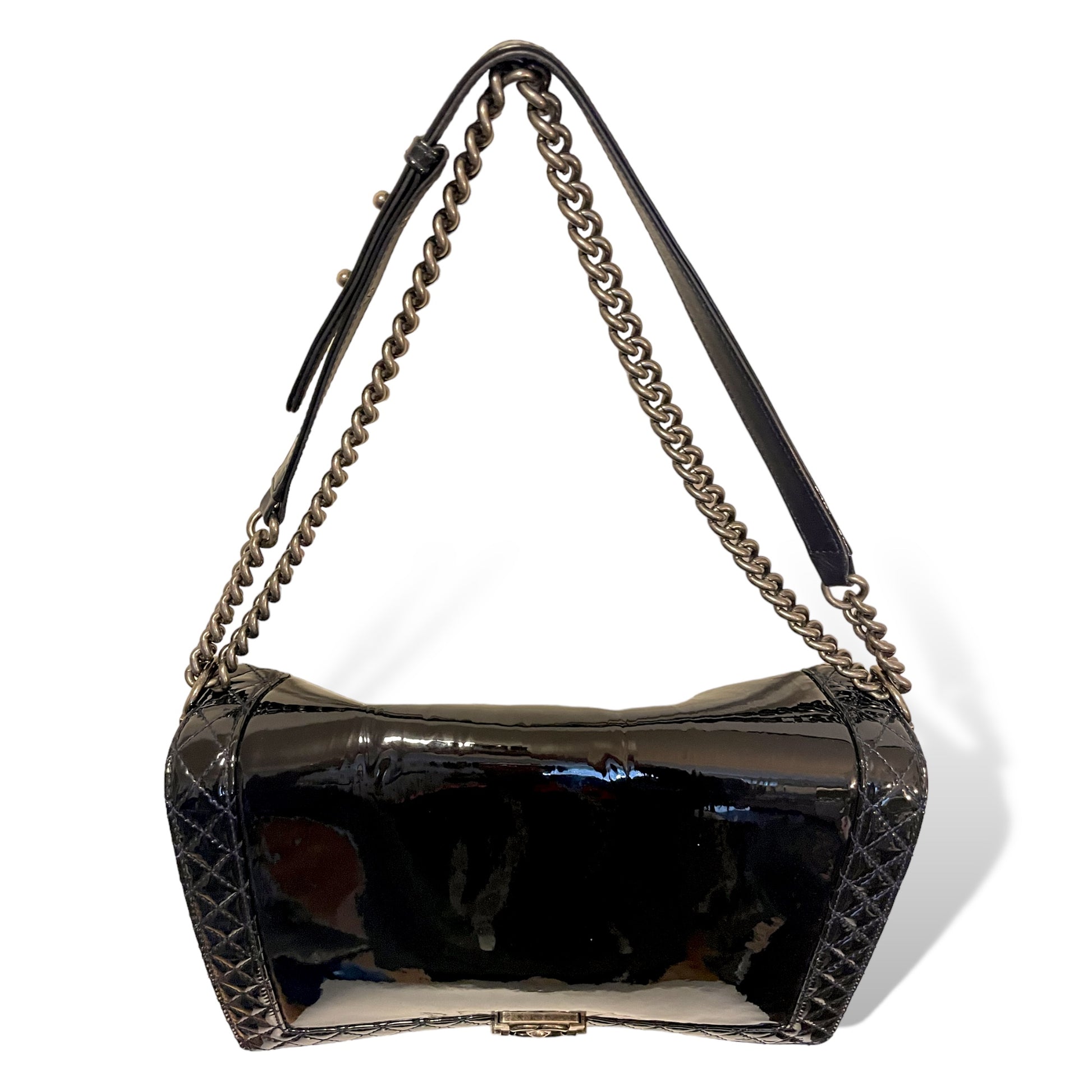 Crafted with the highest attention to detail, this Chanel Reverso Boy Flap Bag Patent Large is a  timeless investment piece that will elevate any outfit and last for years to come.