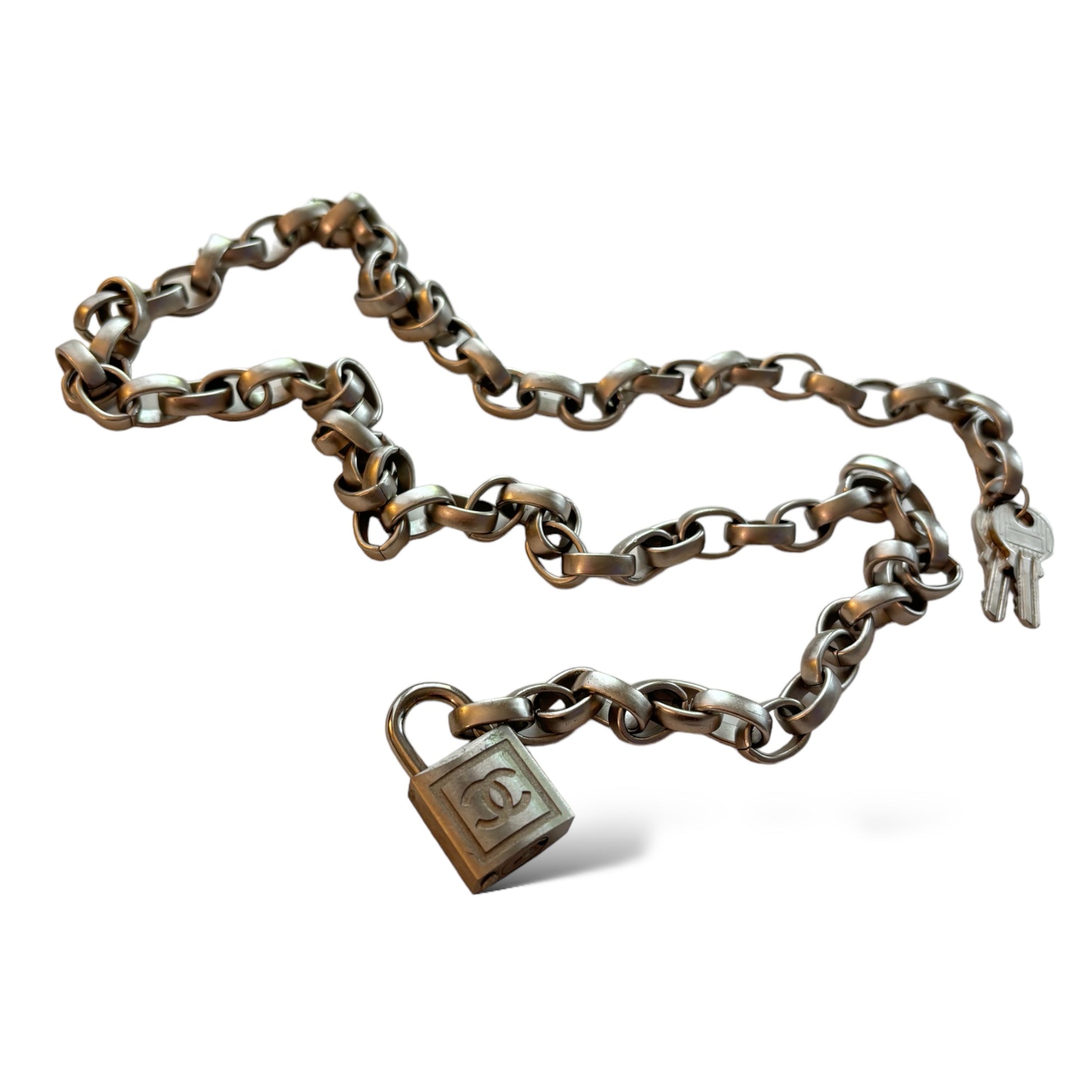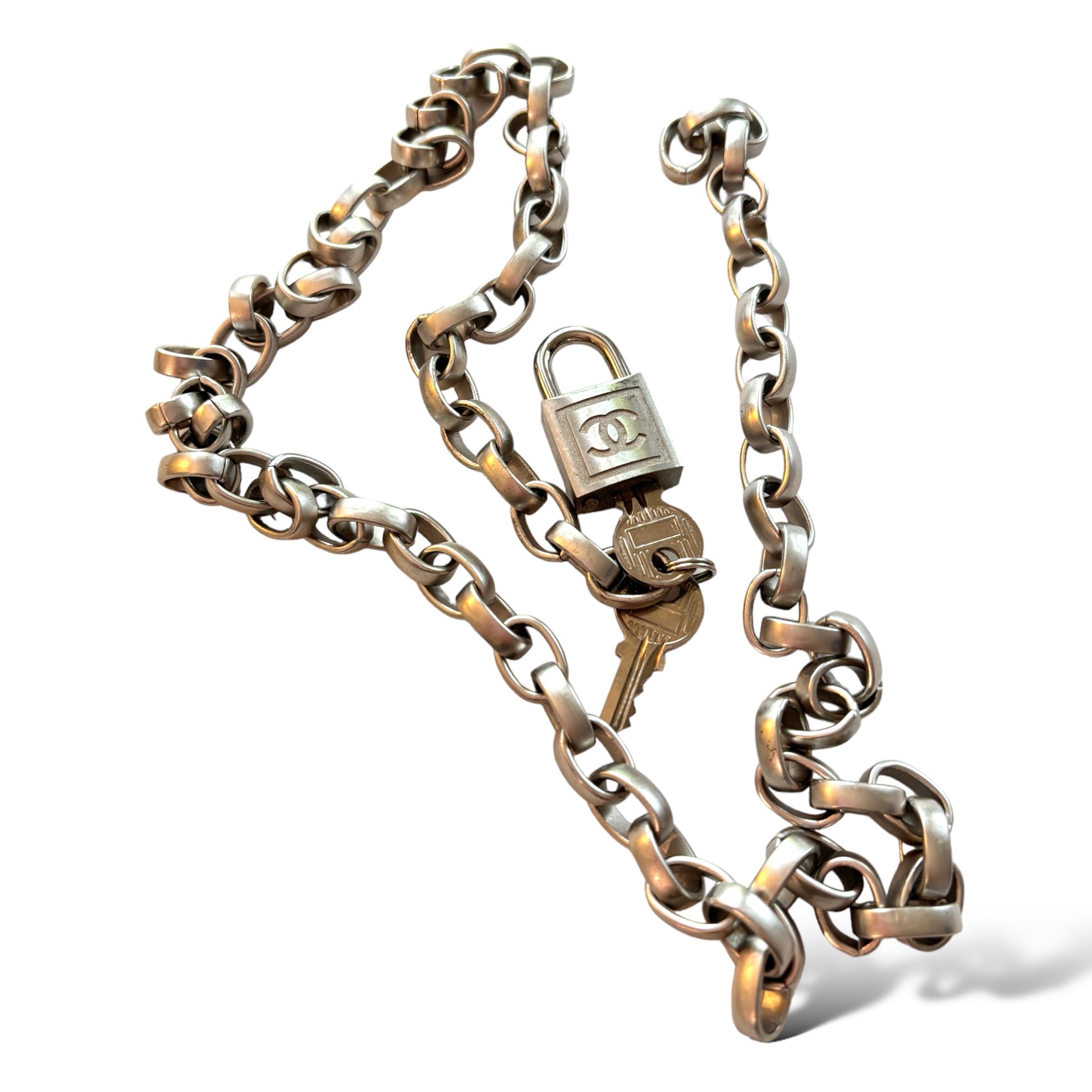 -Chanel vintage silver plated brass cable-link belt with signature interlocking CC logo, padlock fastening, set of keys. It can also be used as a layered necklace.