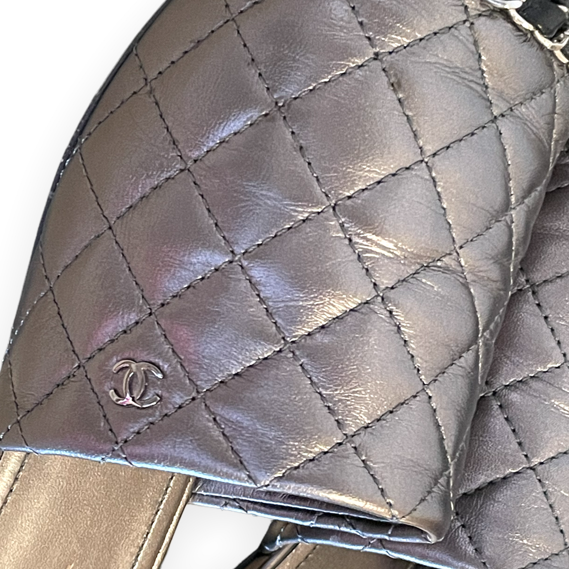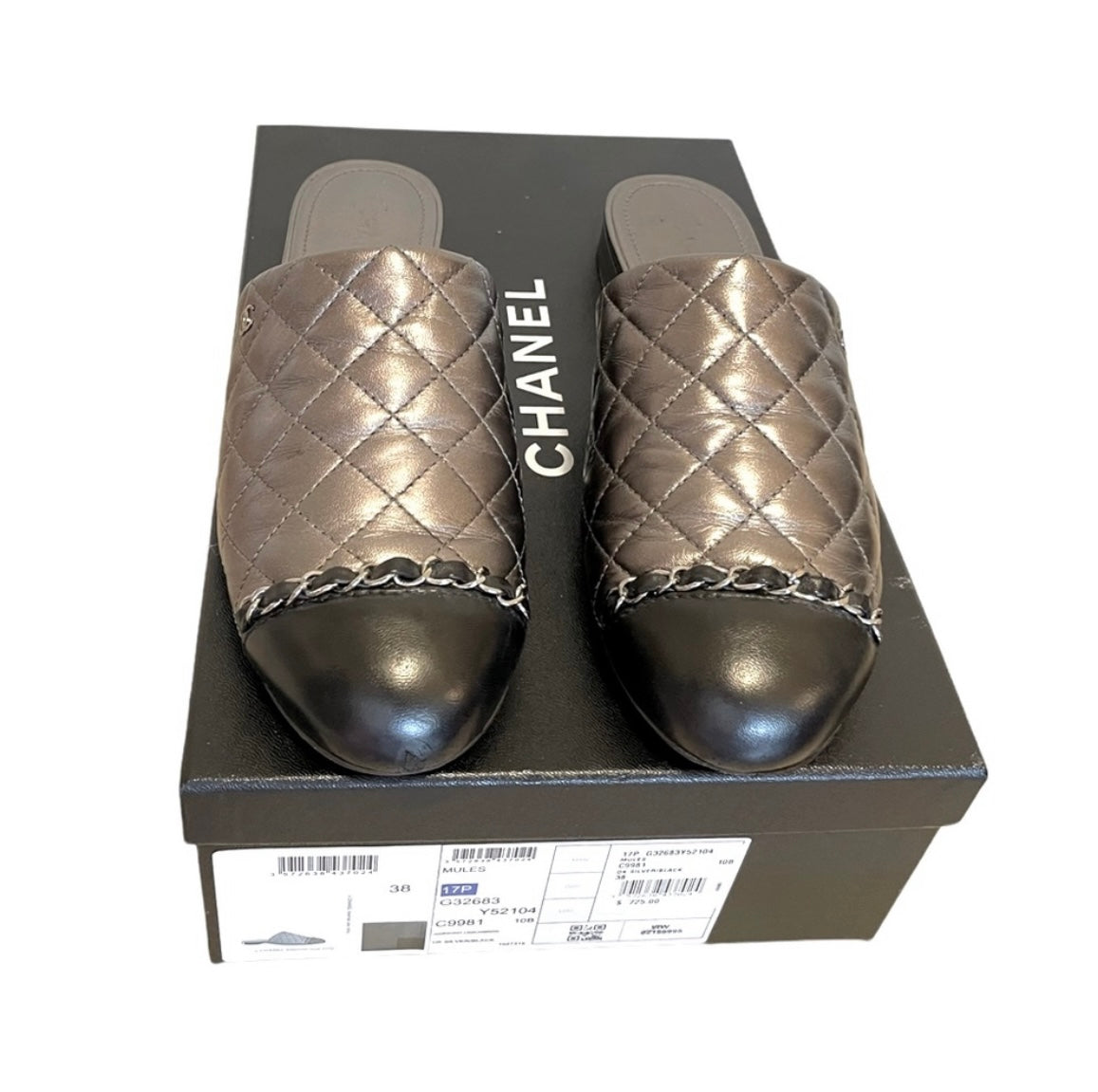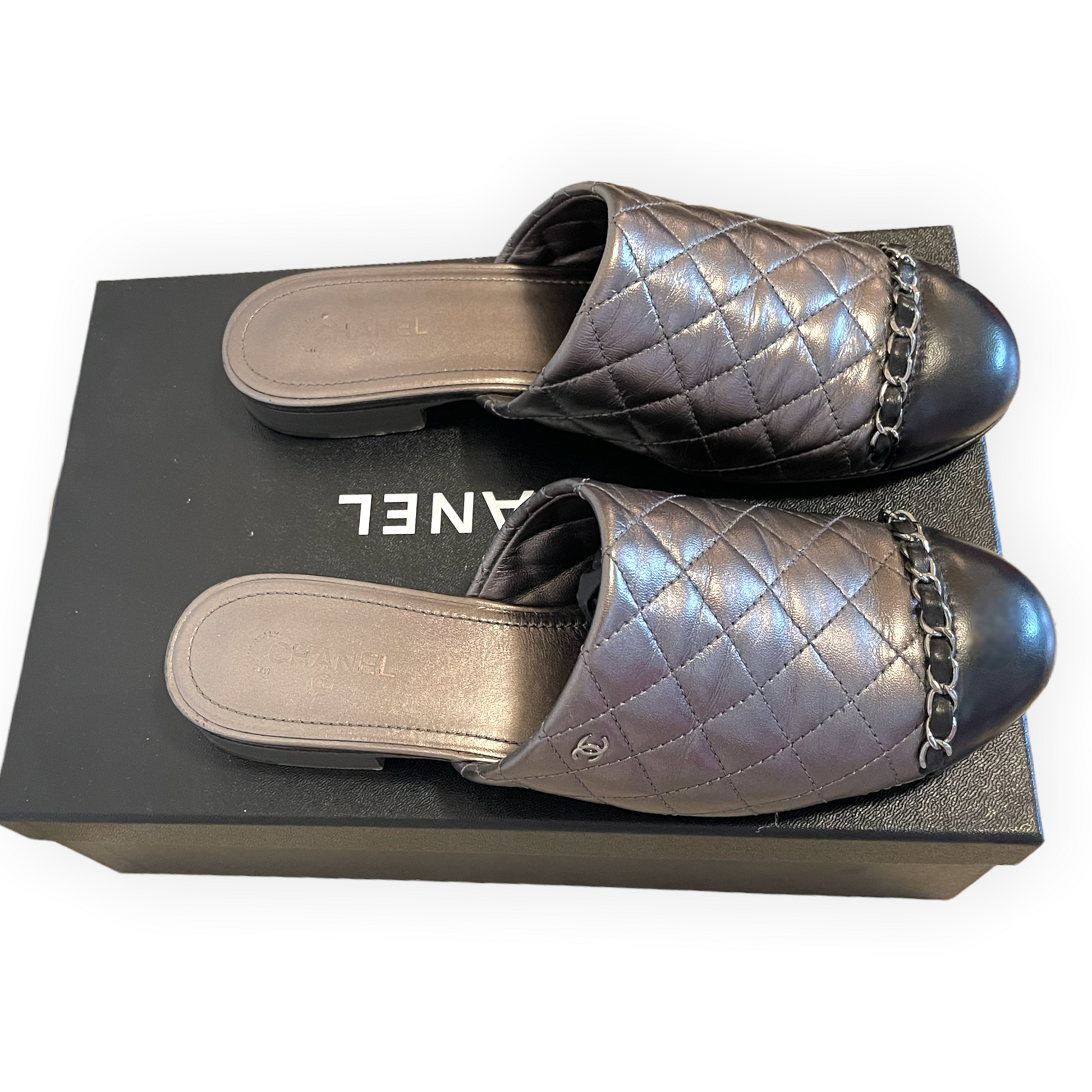 Chanel Iridescent Silver & Black Quilted Lambskin Mules