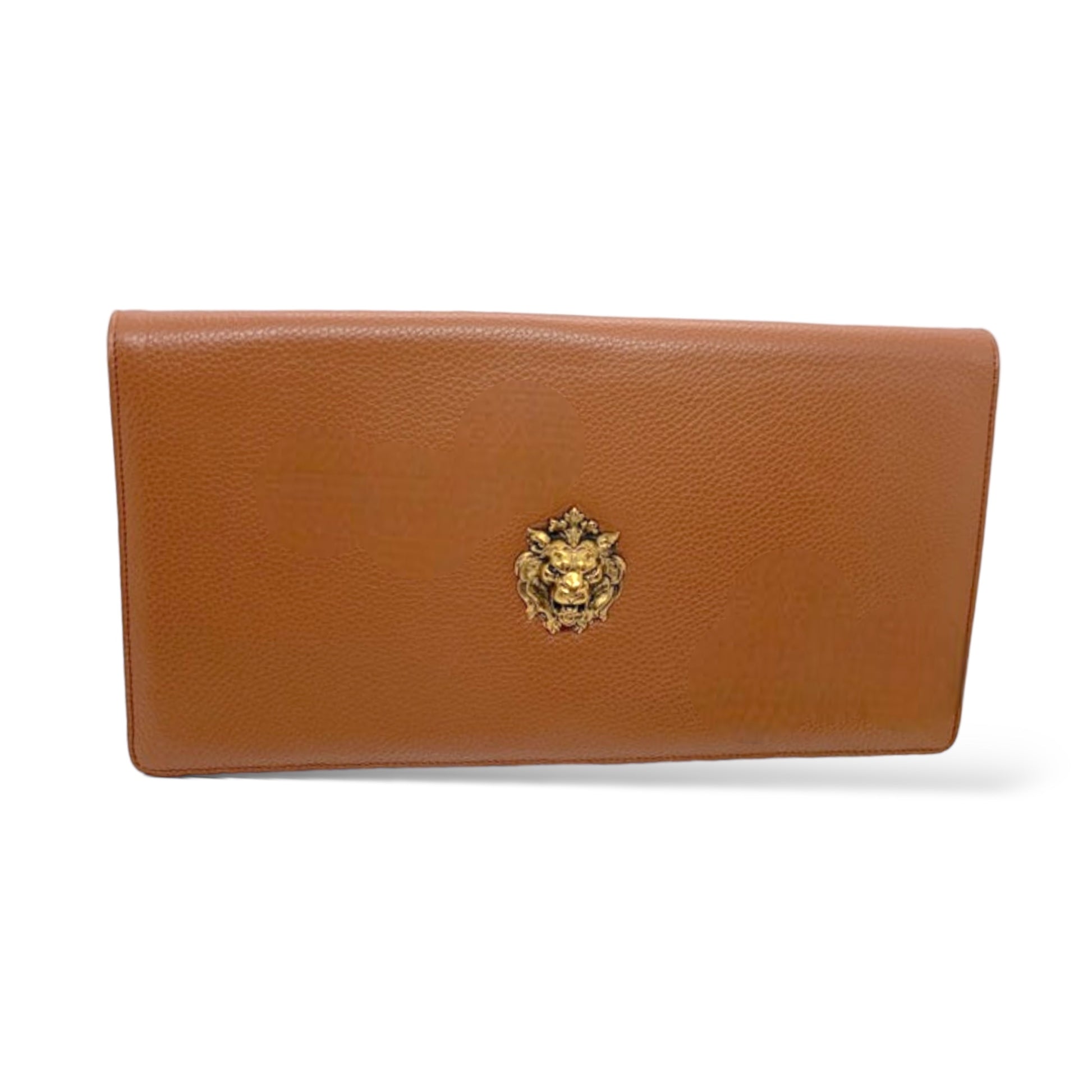 ELA STONE Paris Grained Cognac Leather Clutch Golden Bronze Hardware Magnetic snap closure Golden Metal Lion Head Detail on Front Emerald Green Lining Two side pockets -Made in Paris MEASUREMENTS: -width: 13.5” -height: 7.5”