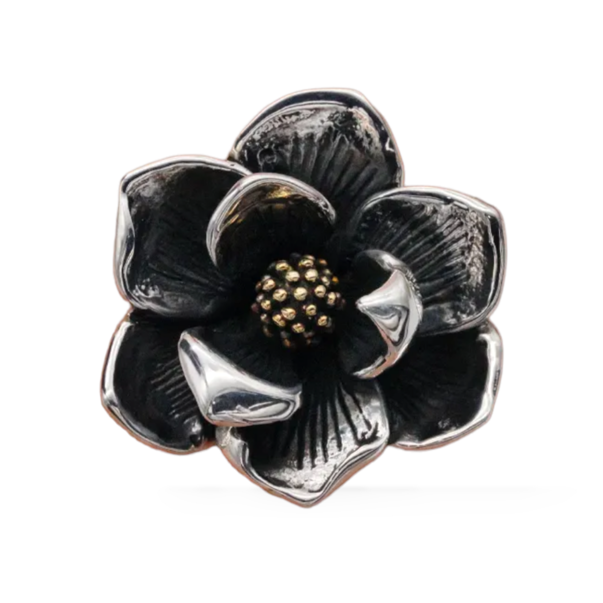 This lovely ring from King Baby is crafted of solid sterling silver and has a Magnolia flower motif.