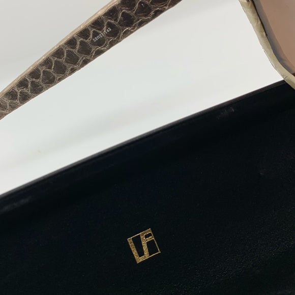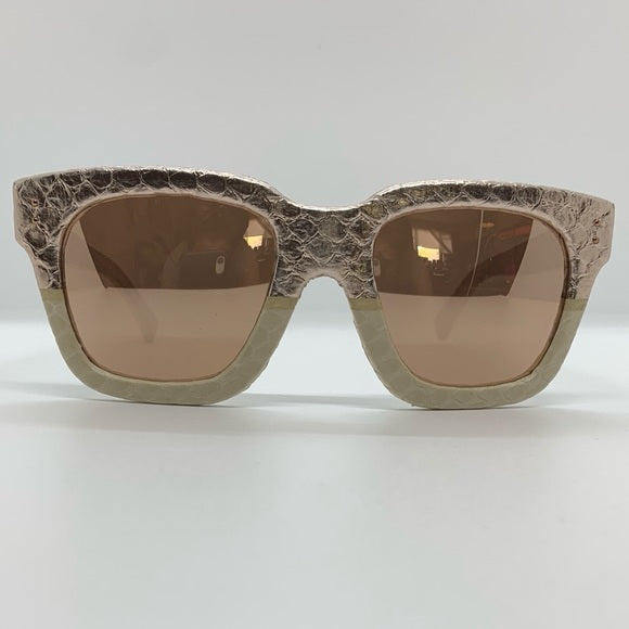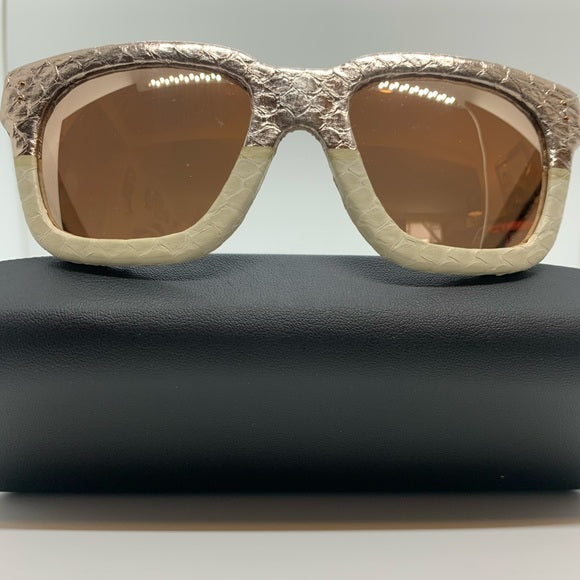 Linda Farrow Rose Gold Snakeskin 52mm Sunglasses DETAILS: Bi-color frames go exotic with a textural snakeskin finish in metallic leather. -100% UV protection. -Acetate/leather. -Made in Japan. -SIZE: 52mm lens width.21mm bridge width.145mm temple length. Includes all original packaging, proof of purchase and authenticity.
