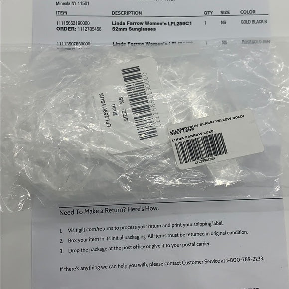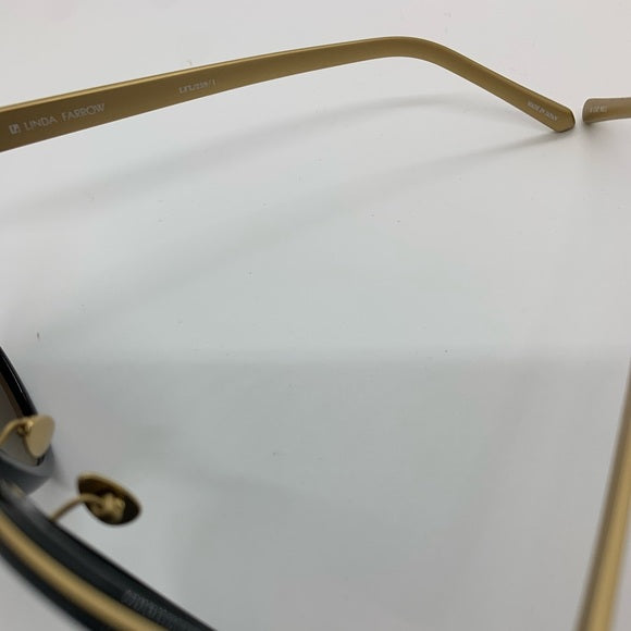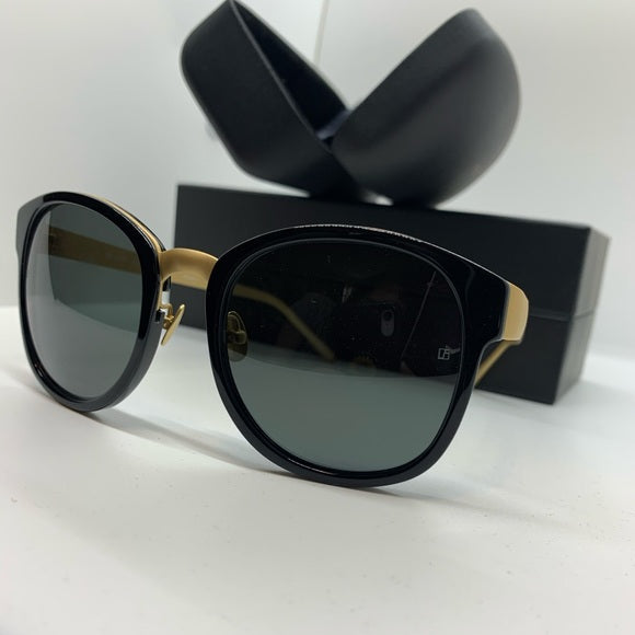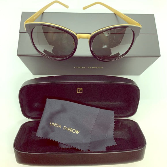 These timeless, luxurious Linda Farrow sunglasses made with black Italian acetate frames are accented with 18-22 carat yellow gold-plated hypoallergenic titanium running across the top half of the back of the frame into the temples. Paired with dark grey solid nylon lenses, they are hand finished with signature details including raised pins & the Linda Farrow logo. Measurements: 52-20_140 Details: 100% UV protected ZEISS lenses Acetate frame with titanium temples -Made in Japan -sku:LFL259C1SUN