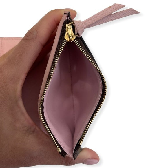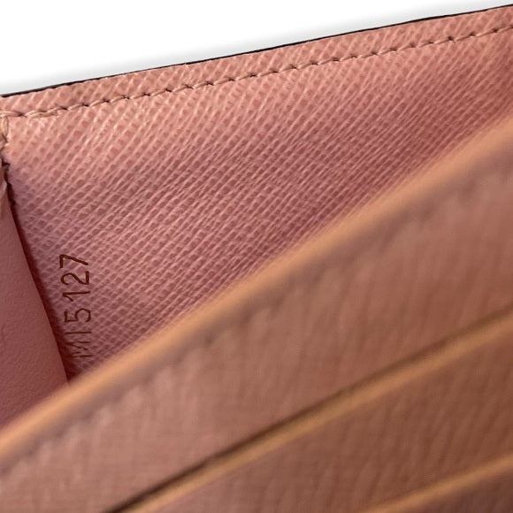 Crafted of traditional Louis Vuitton monogram coated canvas. The wallet features: -pink leather snap closure -Opens to a matching pink cross-grain leather interior with -6 card slots, patch pockets, a billfold, and a zipper compartment MEASUREMENTS: Length: 4.75 in Height: 3.5 in Width: 1 in Designer ID#: MI5127 Comes with: Dust Bag & Box