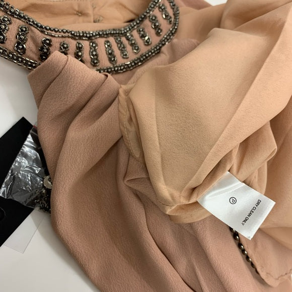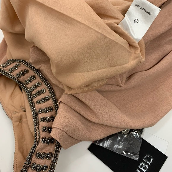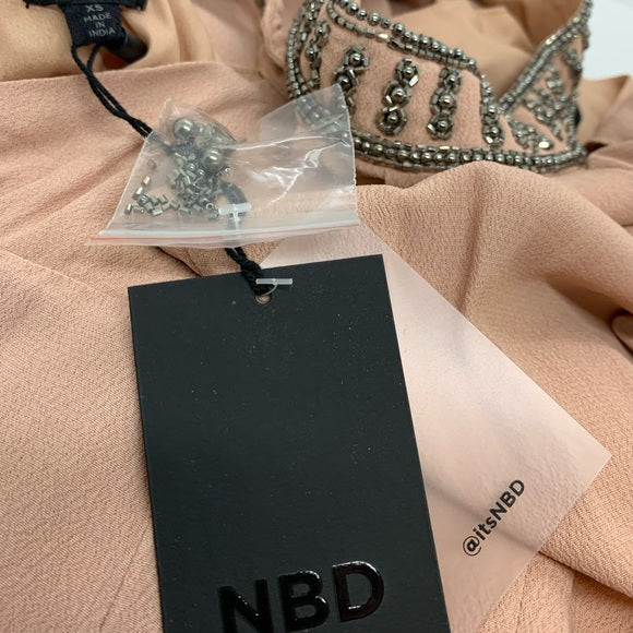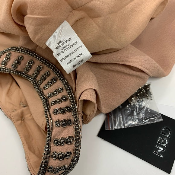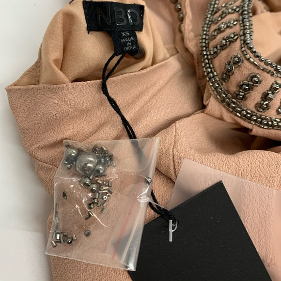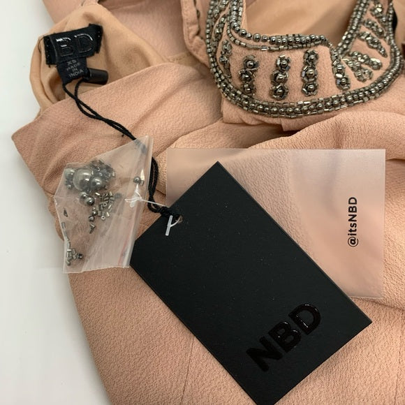 NBD Lourdes Dress in Misty Rose SIZE: XS PRODUCT DETAILS The REVOLVE exclusive Lourdes Dress features a swingy shift silhouette with a high-cut neck, a T-back, & a notched mini hem. Glitzy embellishment adds a dash of glam to this pretty party piece. * Self: 100% viscose * Lining: 100% poly * Hand wash cold * Fully lined * Neckline button closure * Beaded embellishments throughout * Hidden side zipper closure SIZE & FIT: * Modeled in size XS * Shoulder Seam to Hem approx 30" in length