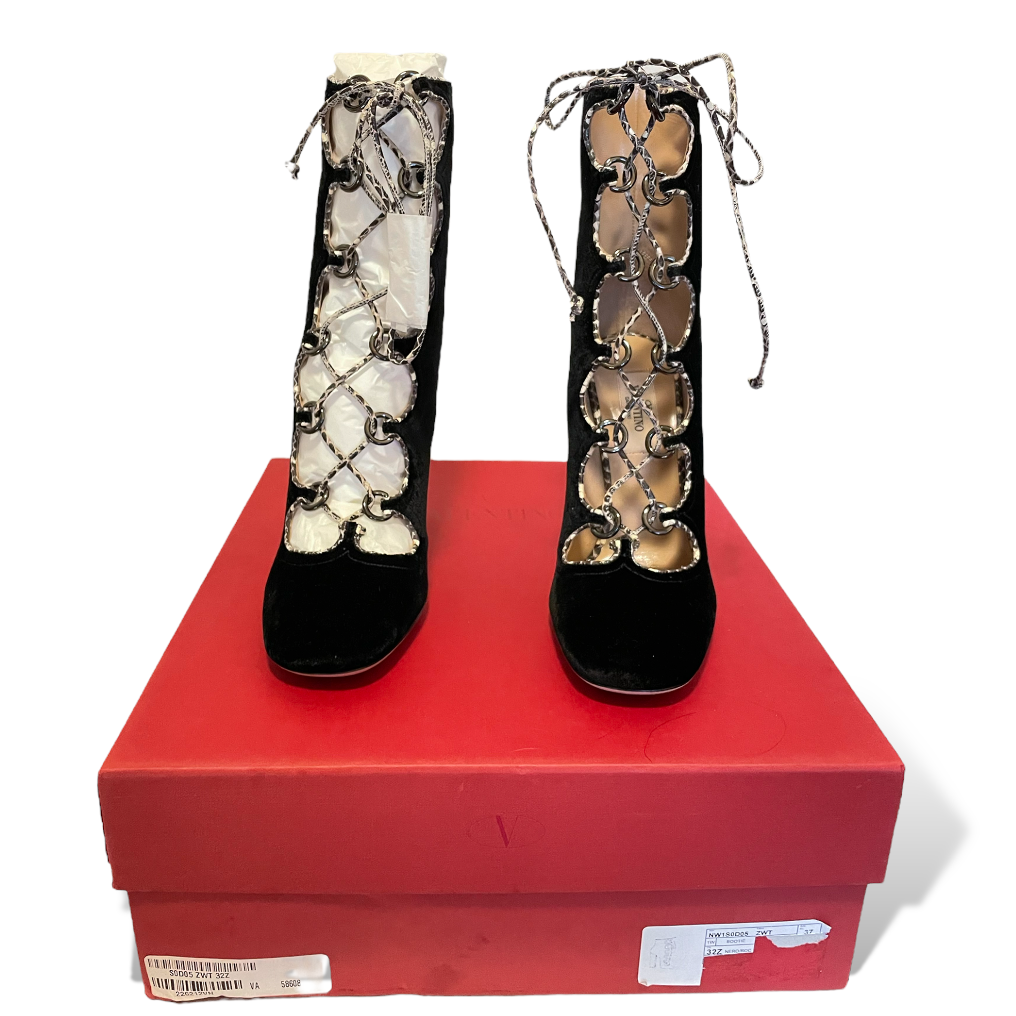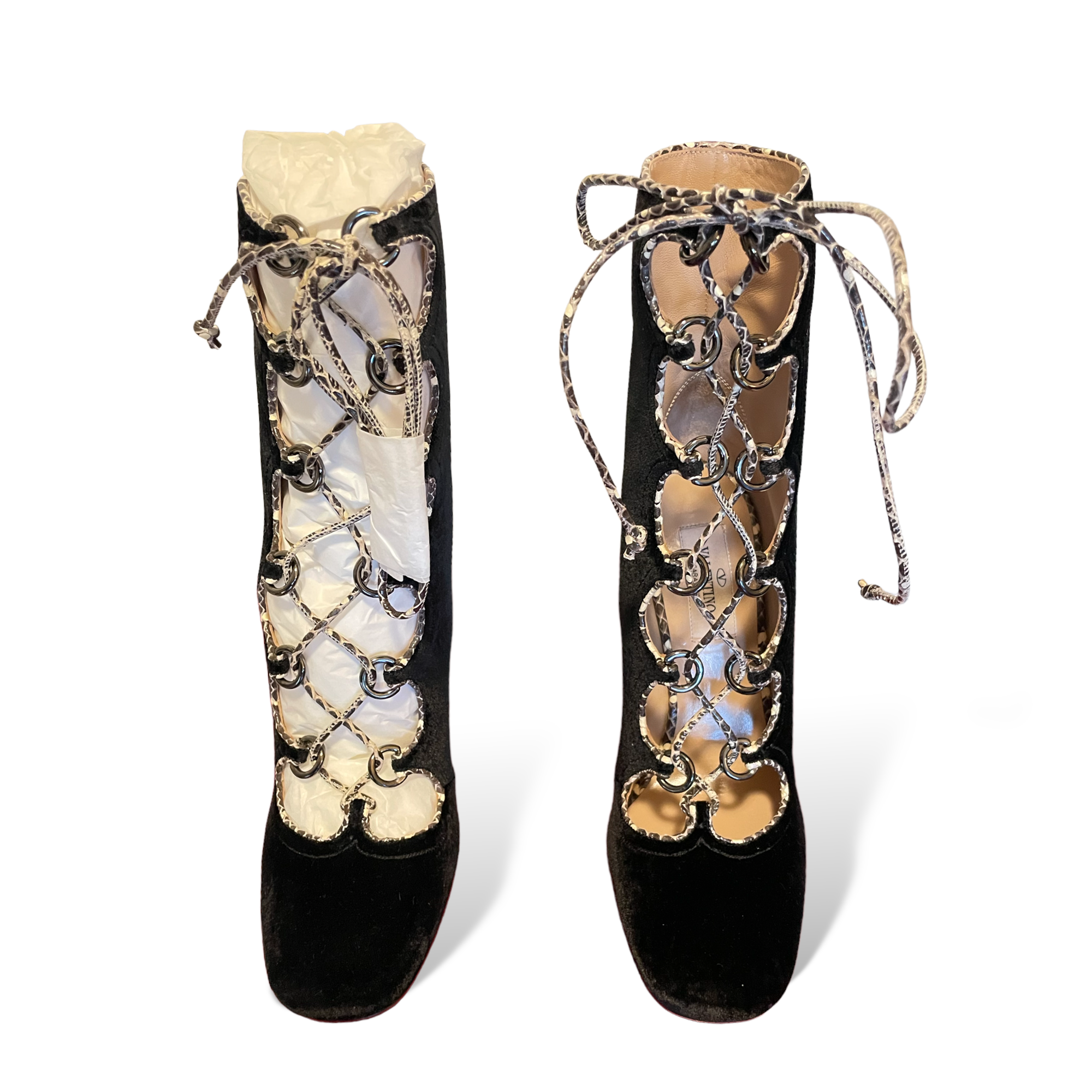 VALENTINO GARAVANI Black Velvet with Snake Skin Trim Lace up Ankle Booties Size 37