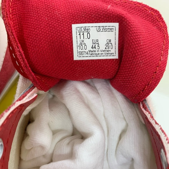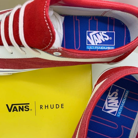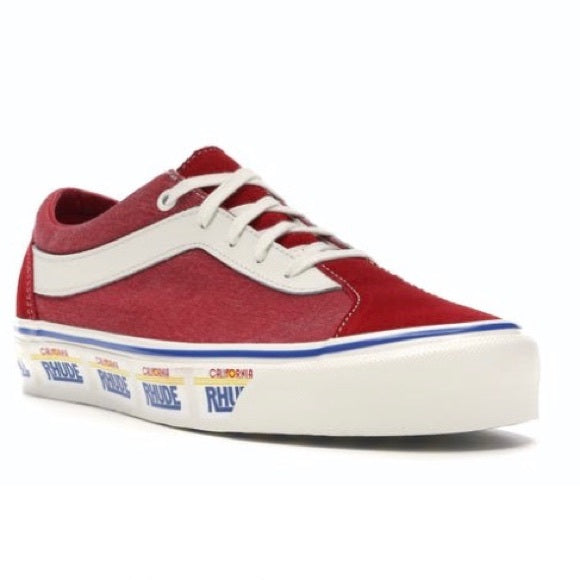 VANS VAULT X RHUDE SIZE: 11 US Racing Red DETAILS Bold Ni silhouette Canvas upper Suede tongue and toe box Metal eyelets Leather stripe on side panel Suede heel wrap Rhude branding around midsole Rubberized 'Vans Off The Wall' patch on rear Flat cotton laces High rubber foxing Rubber outsole Style: VN0A3WLPTHE Color: Racing Red Material: Canvas