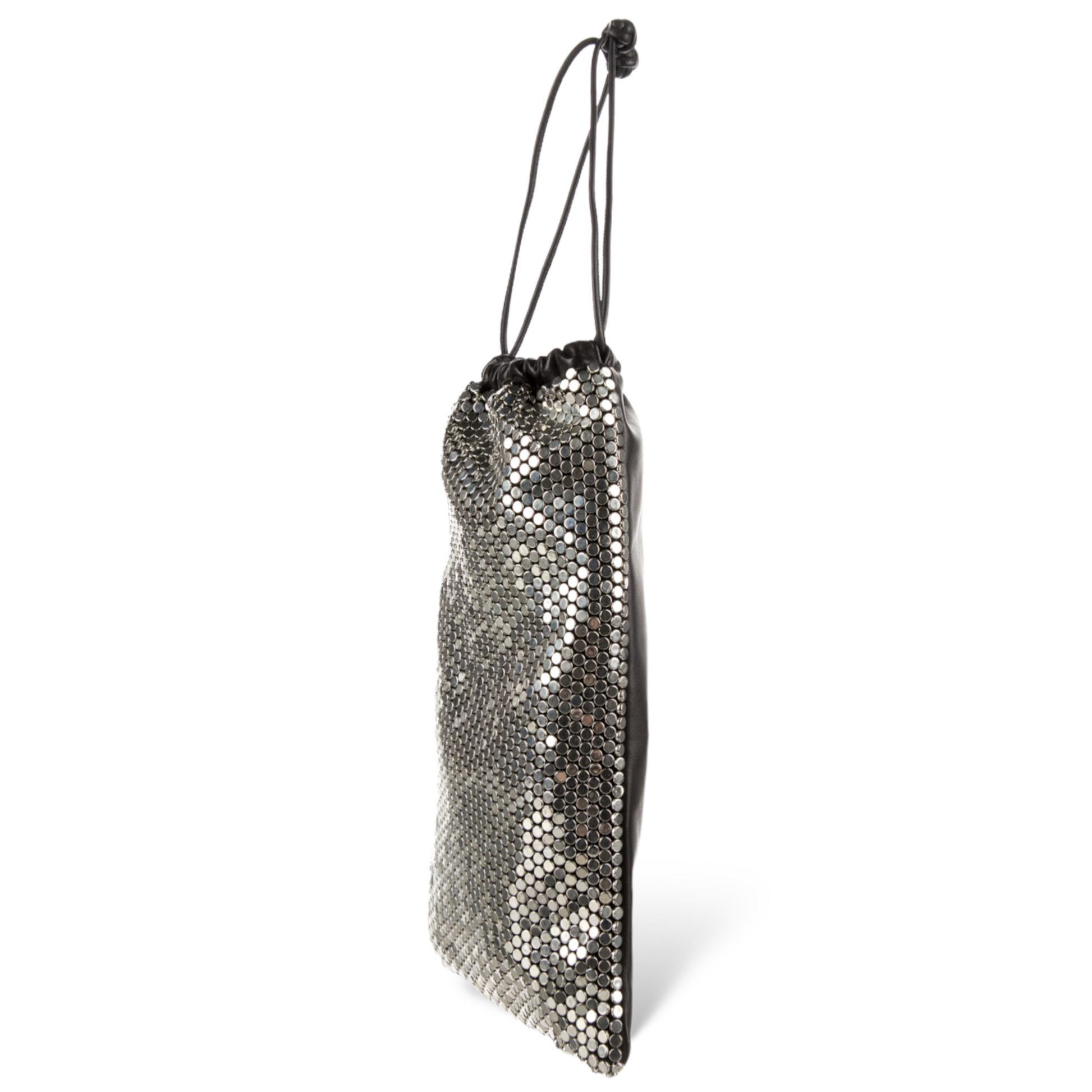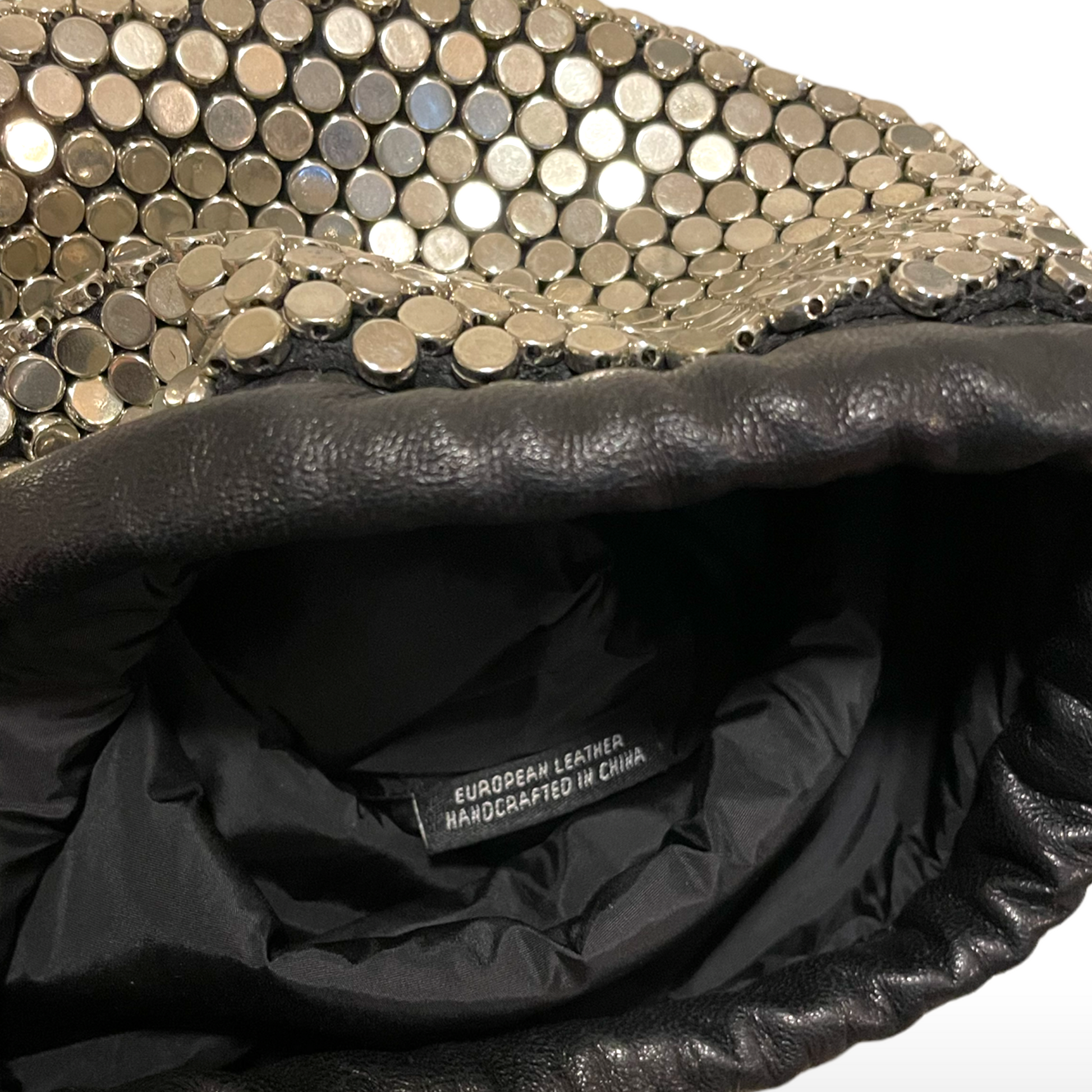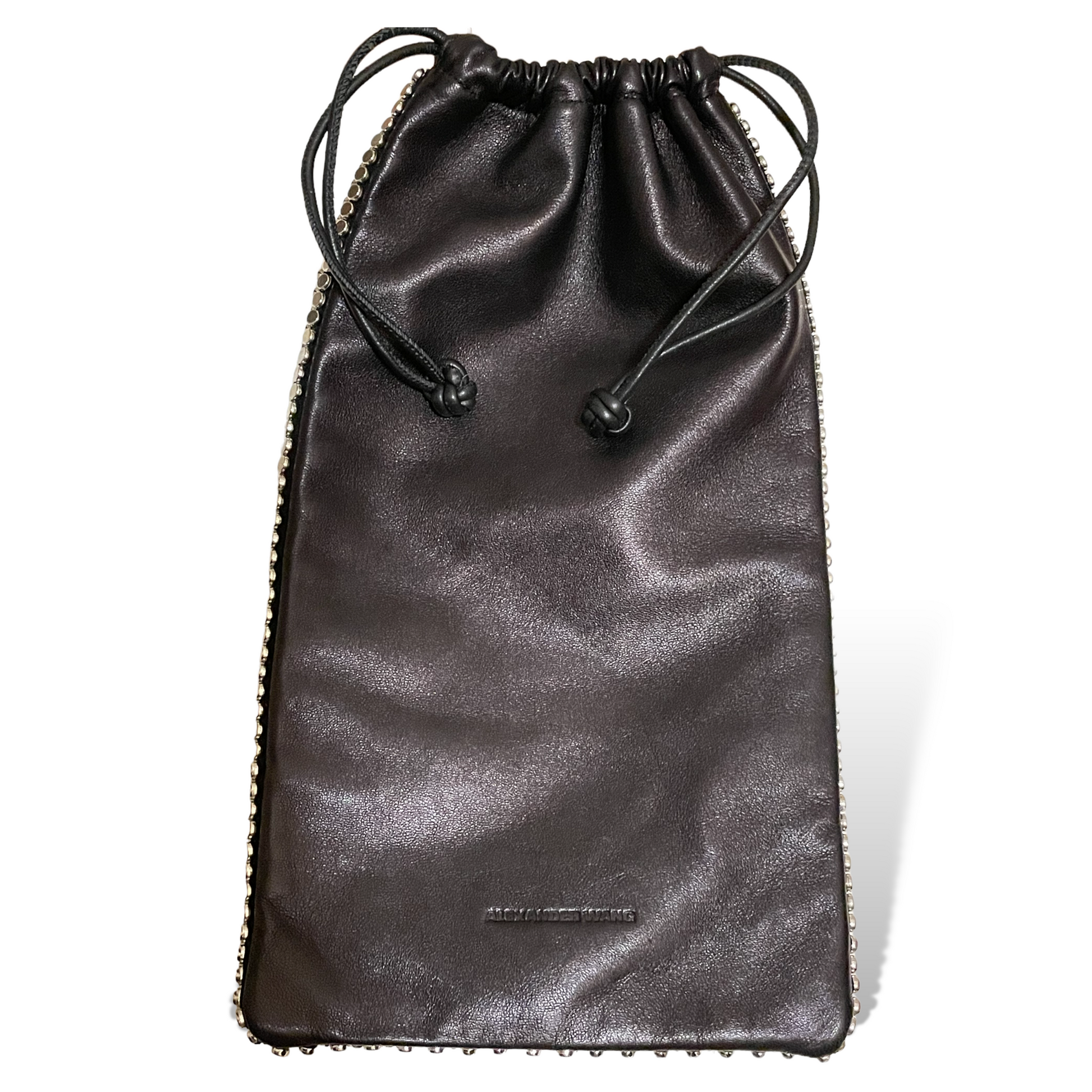 ALEXANDER WANG Chainmail Leather Clutch / Dust Bag in Silver Stud Rhinestones crafted in leather, paves the way to party nights with silver studs giving this little fun pouch a relaxed street savvy vibe. Featuring leather drawstring closure, leather back panel, and silver studded front panel