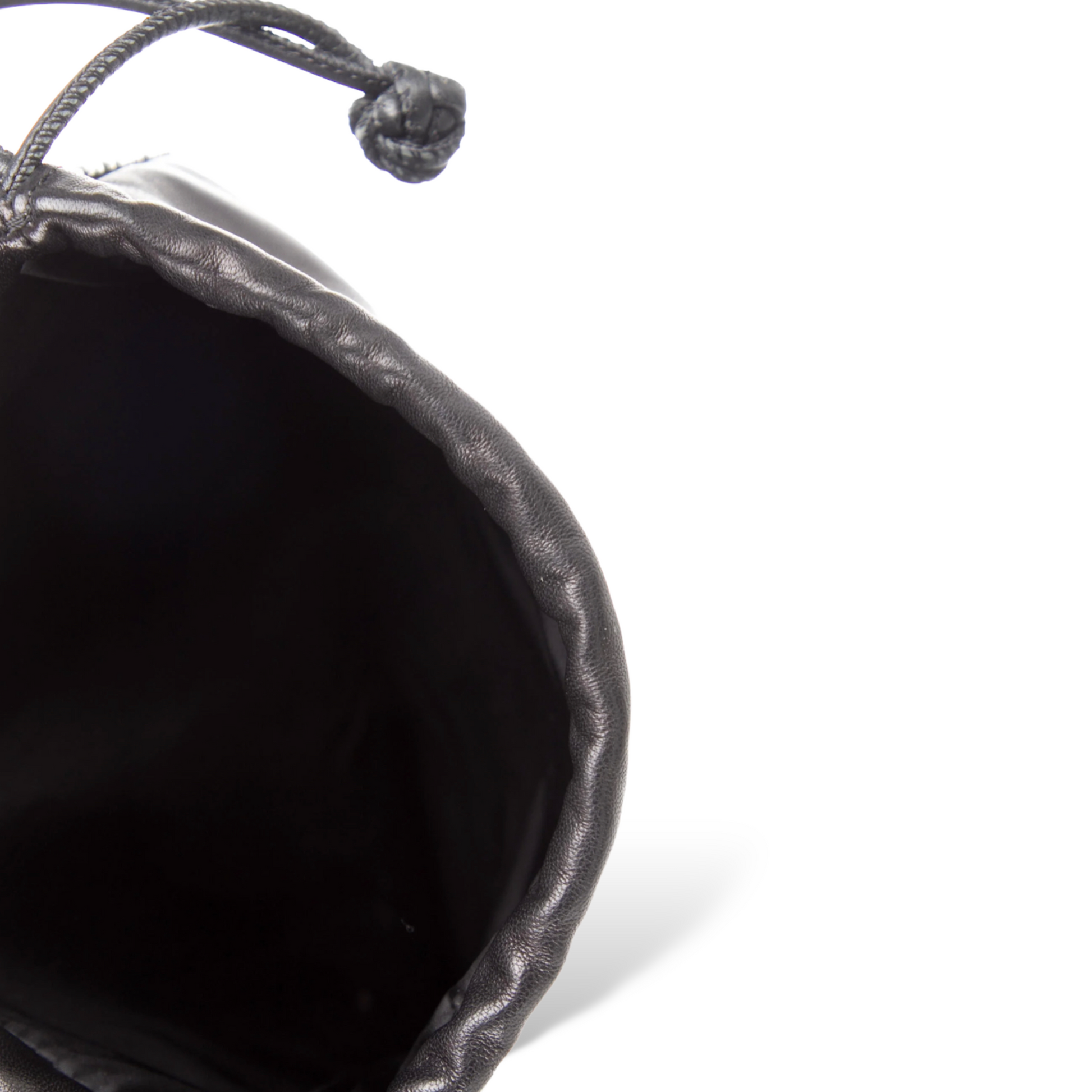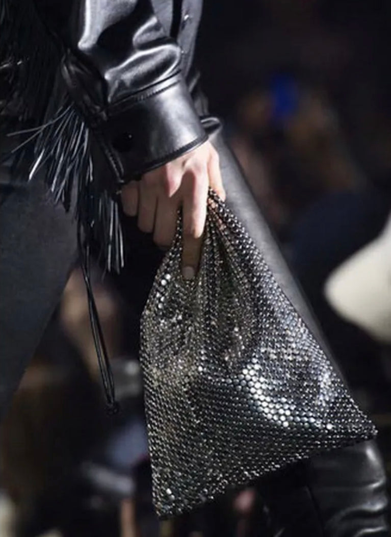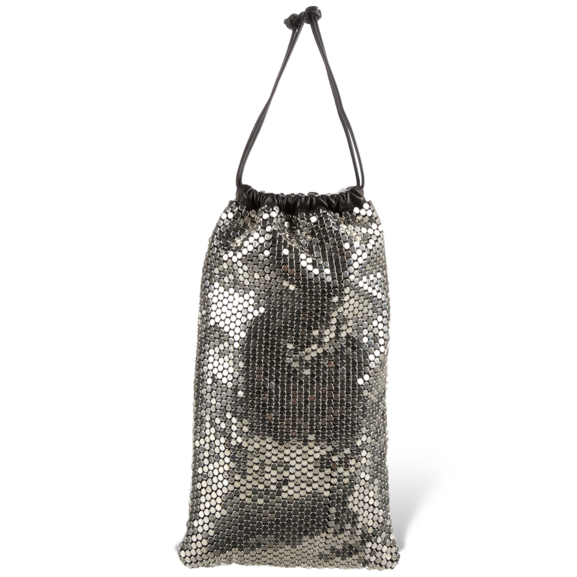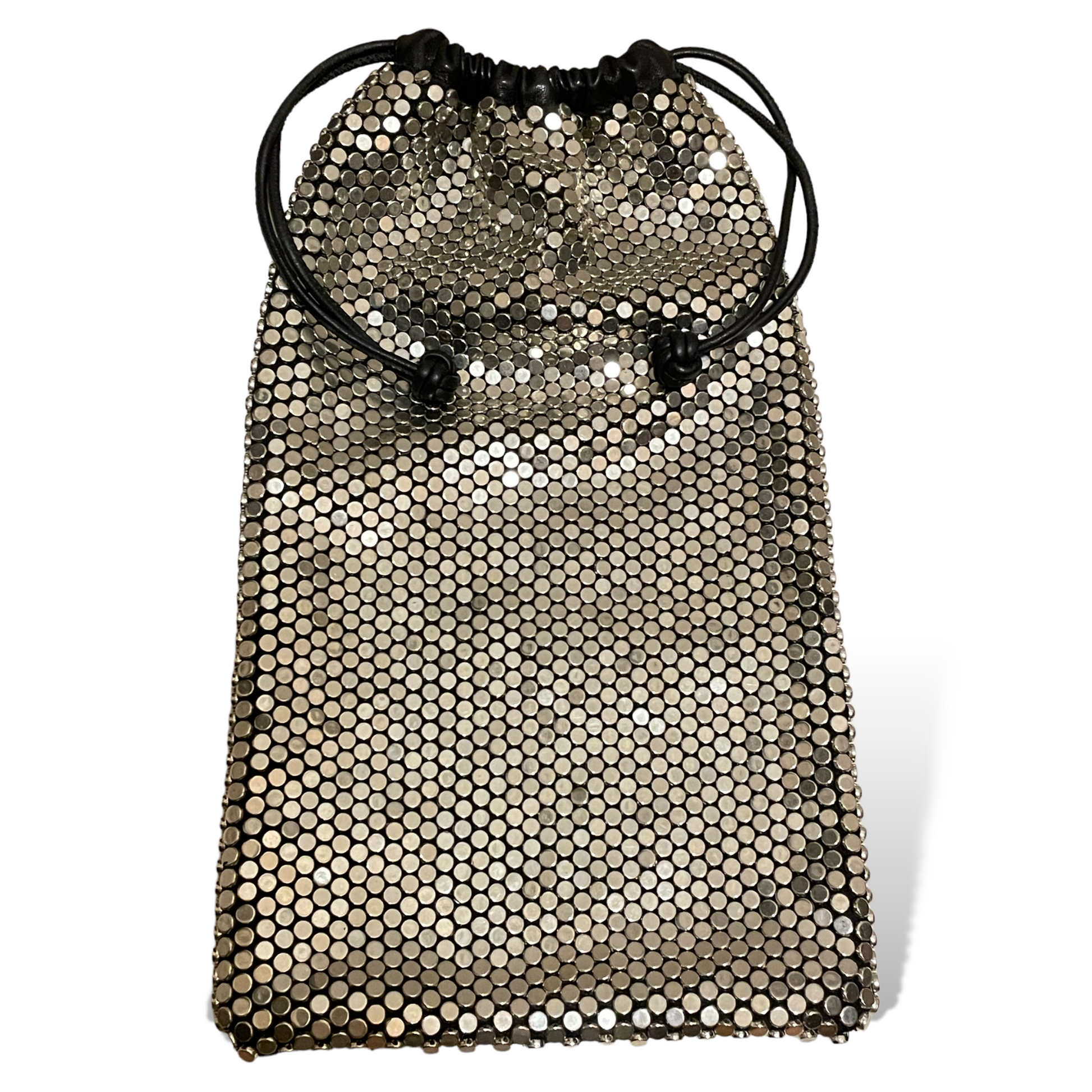 ALEXANDER WANG Chainmail Leather Clutch / Dust Bag in Silver Stud Rhinestones crafted in leather, paves the way to party nights with silver studs giving this little fun pouch a relaxed street savvy vibe. Featuring leather drawstring closure, leather back panel, and silver studded front panel