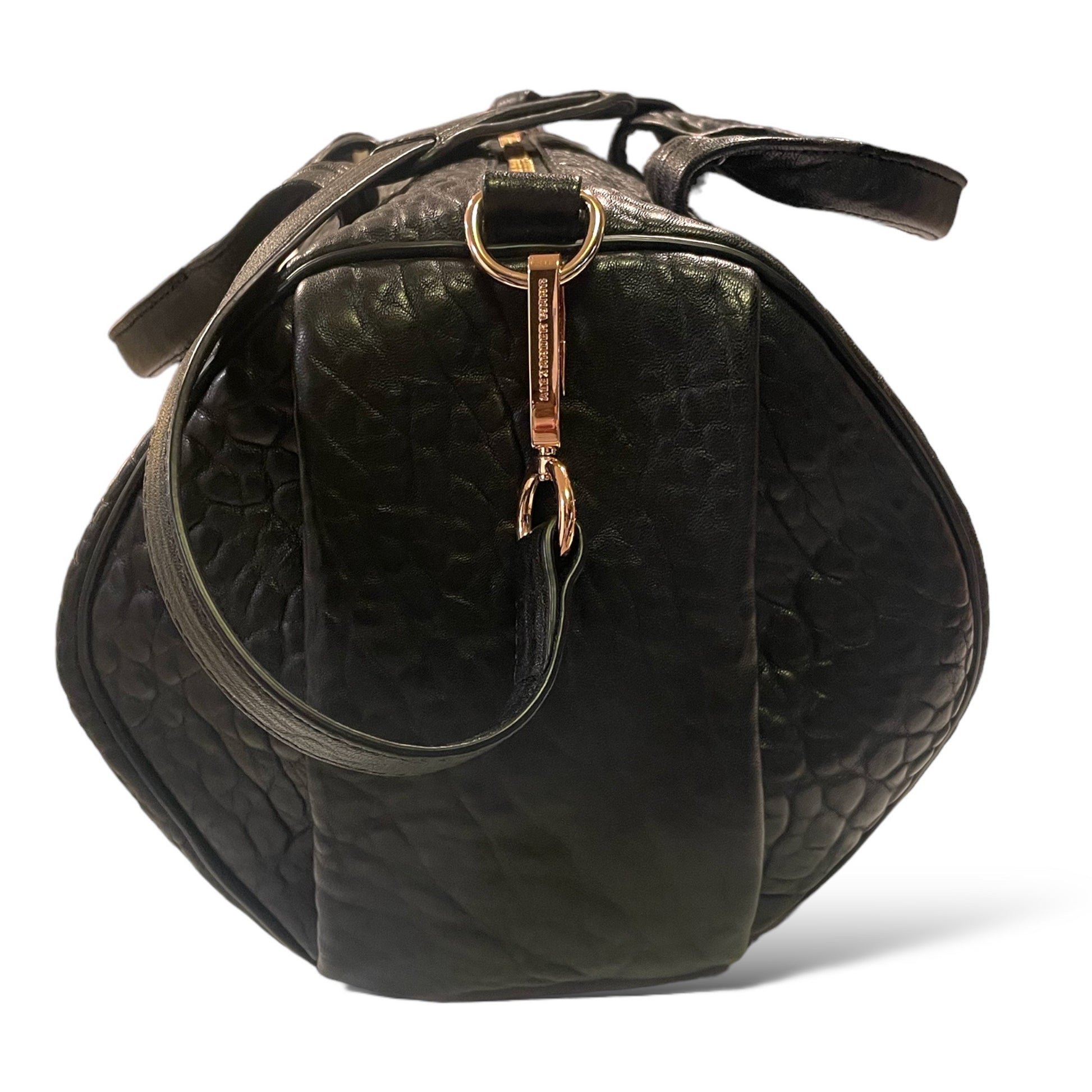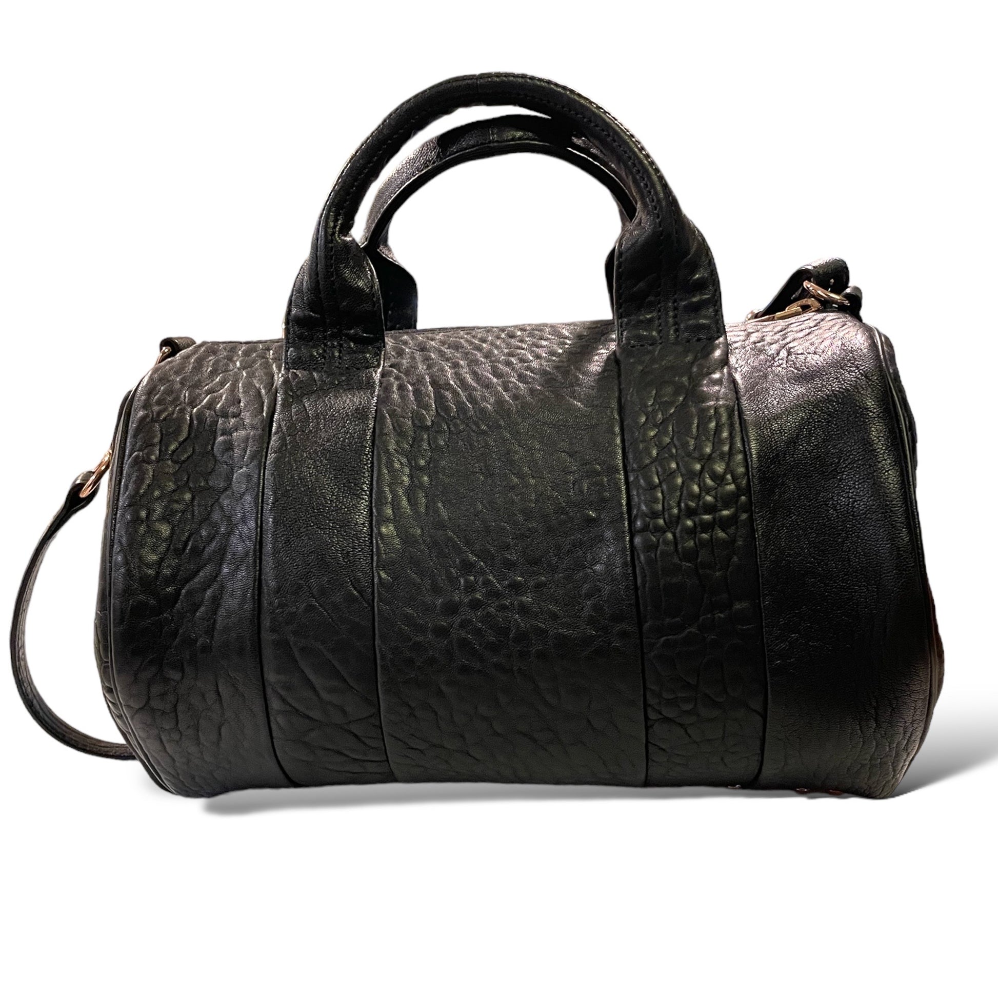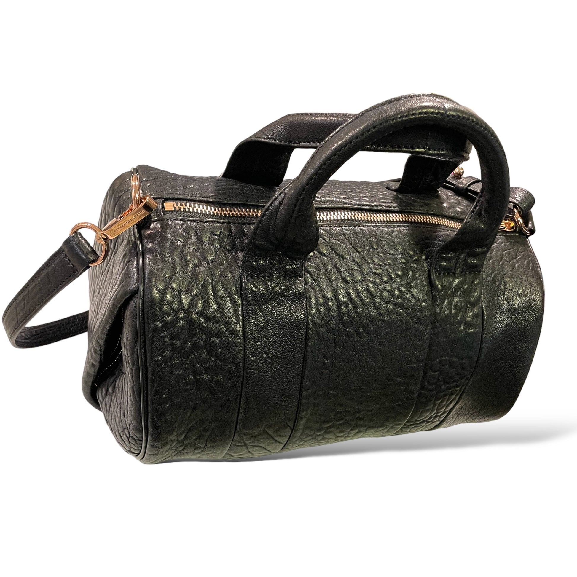 AUTHENTIC ALEXANDER WANG Pebbled Lambskin Rockie in Black and Rose Gold Hardware. This handbag features a duffle silhouette and is crafted of richly textured lambskin leather in black. The bag features short leather top handles, an optional shoulder strap, and a rose gold metal studded base. The top zipper opens to a black nylon fabric interior with zipper and patch pockets.