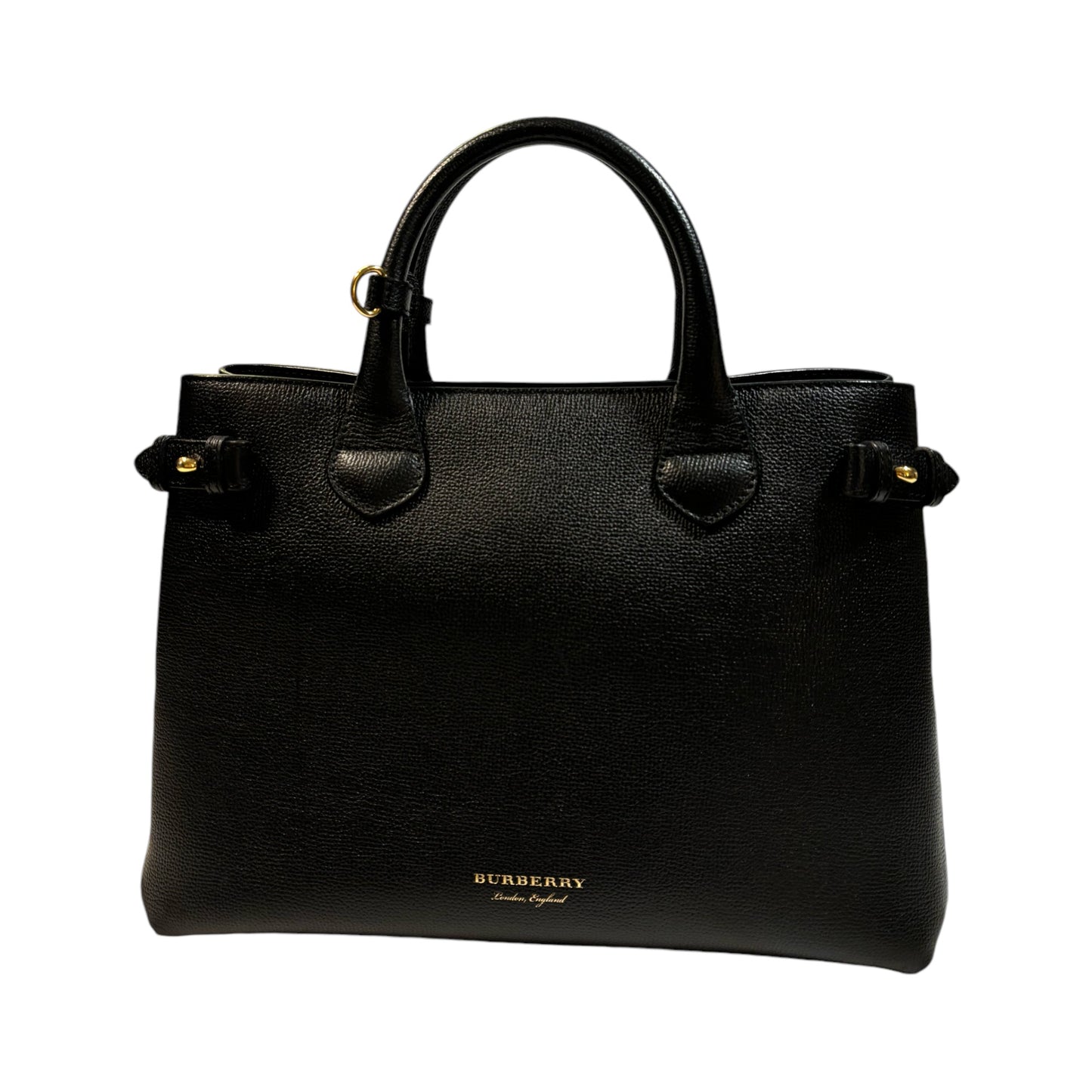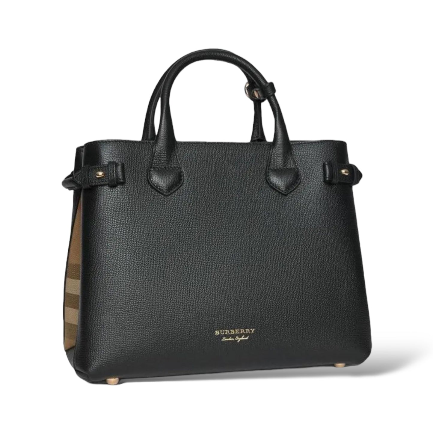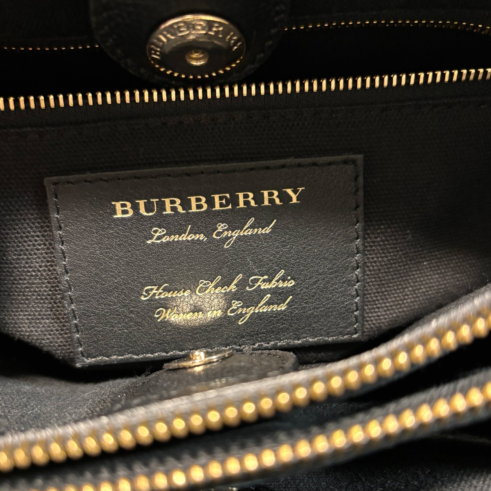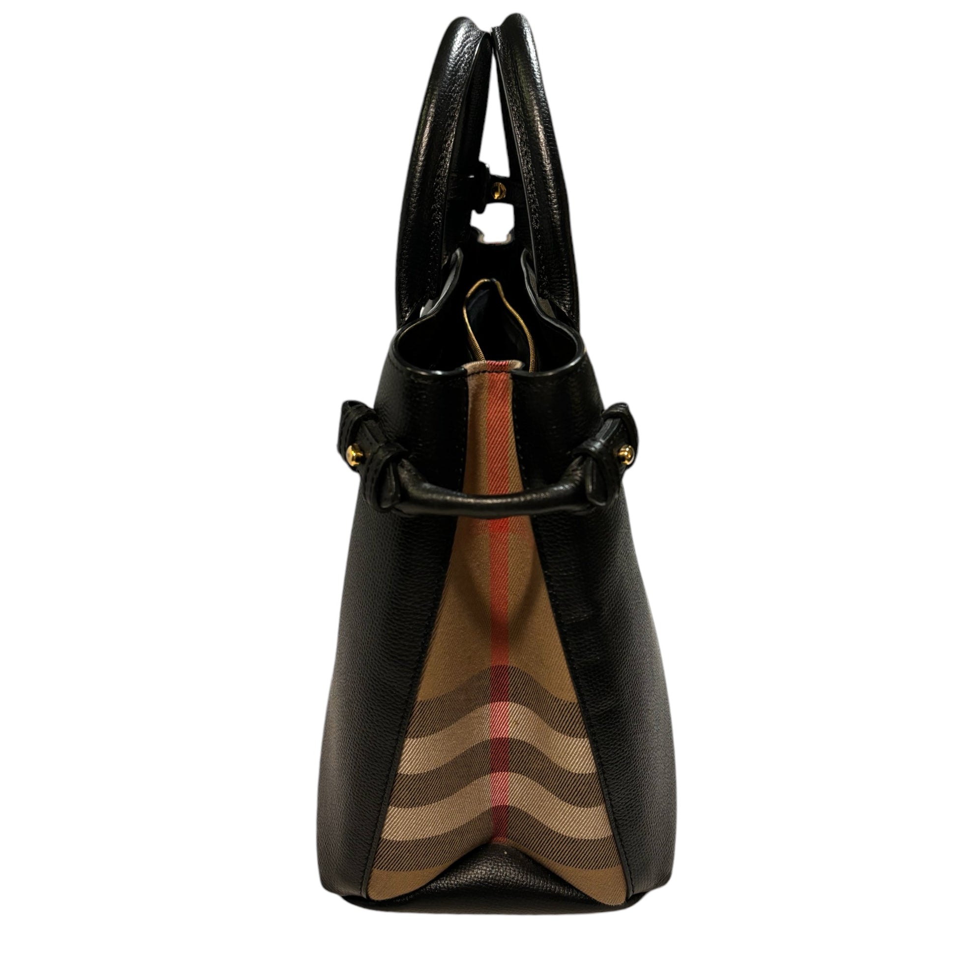 Burberry London England Women's Medium Black Leather And House Check Print Banner Tote Bag