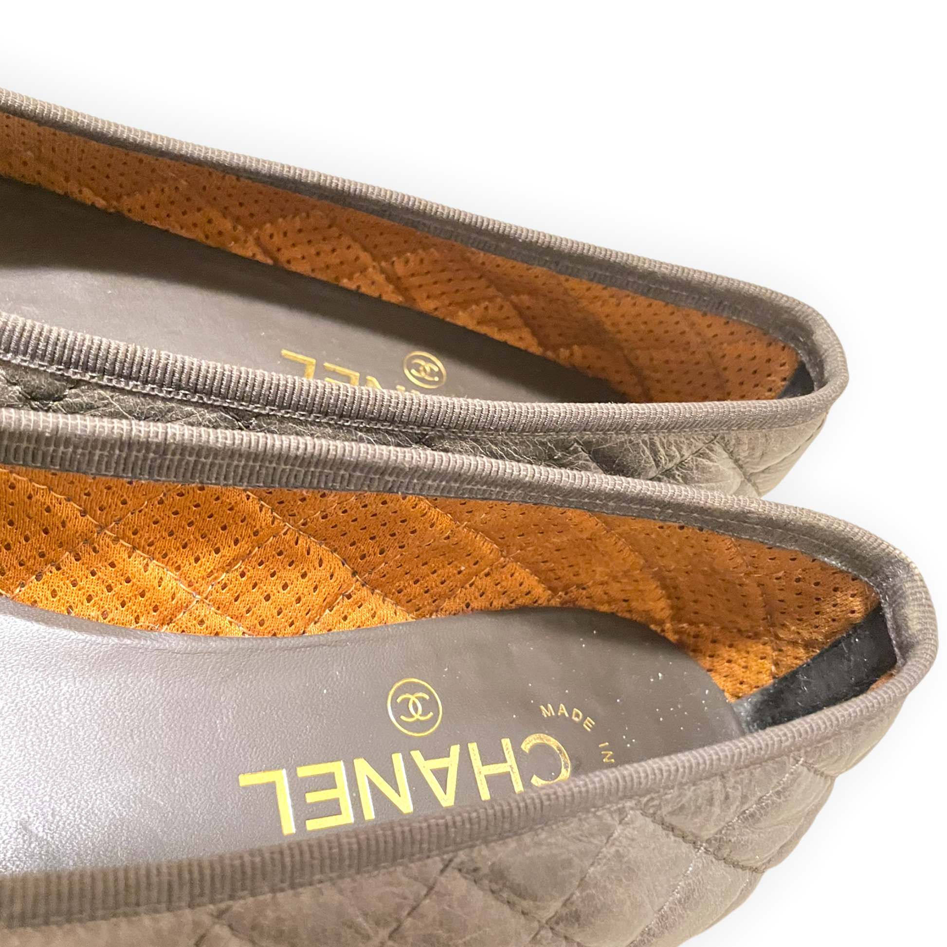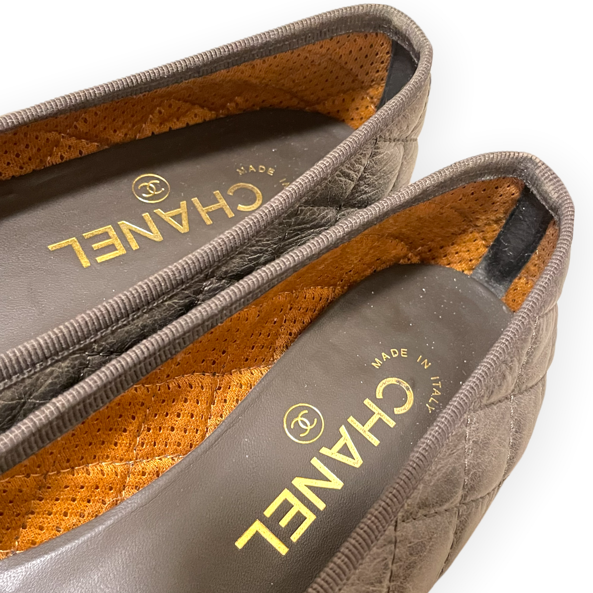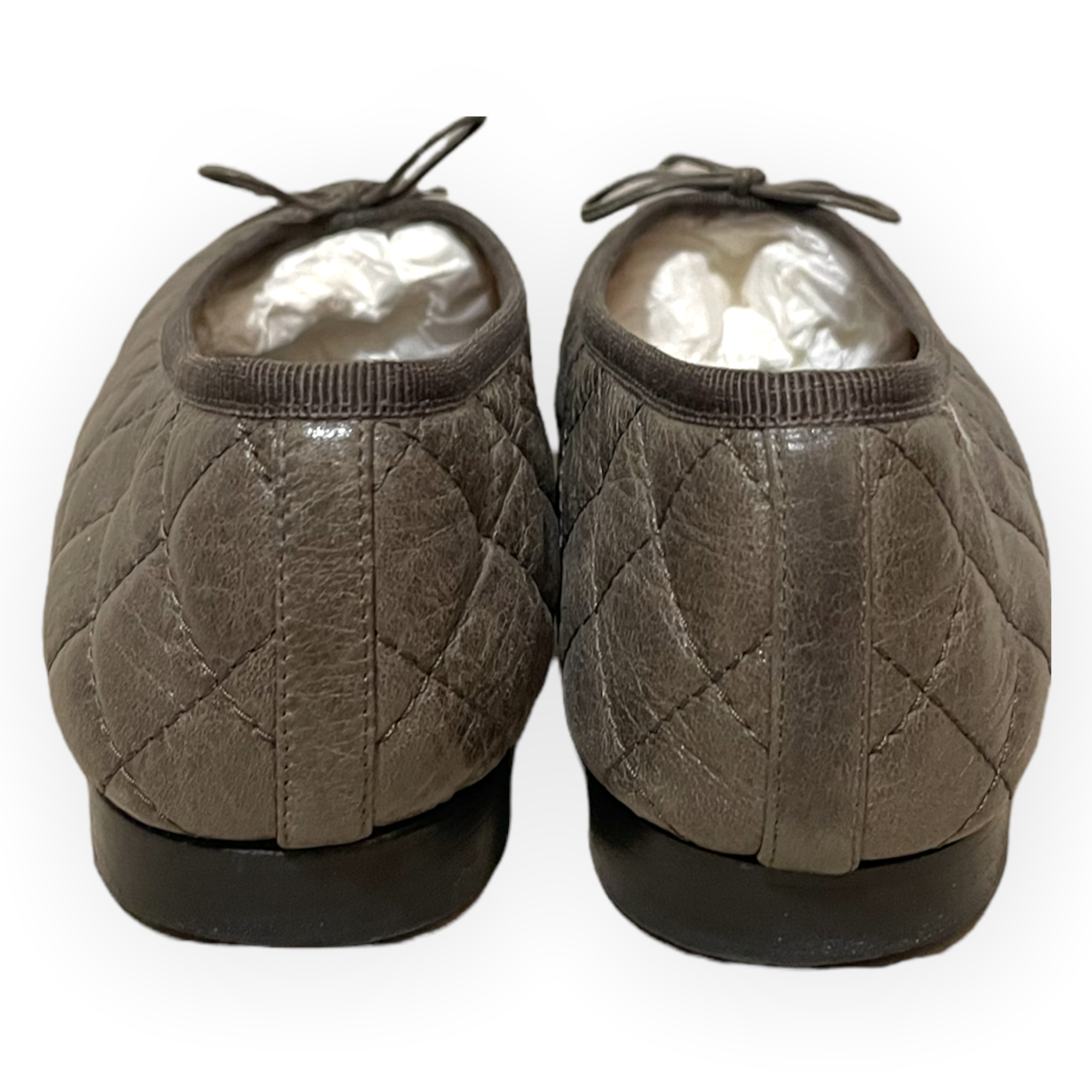 CHANEL Crumpled Calfskin/Patent Quilted CC Cap Toe Ballerina Flats