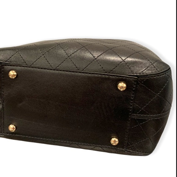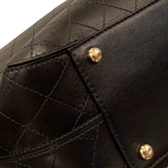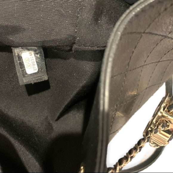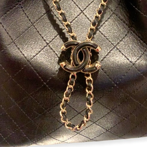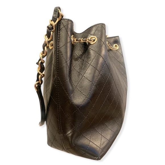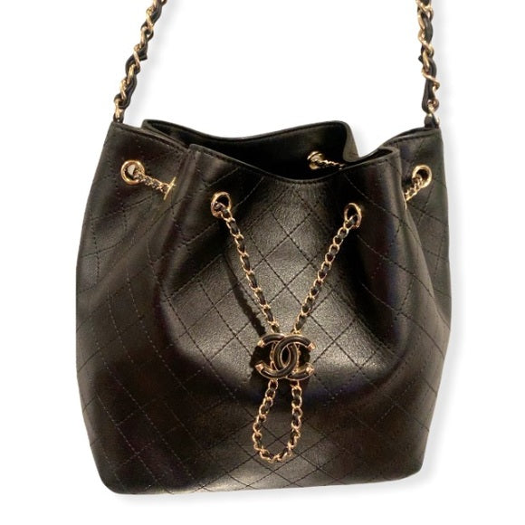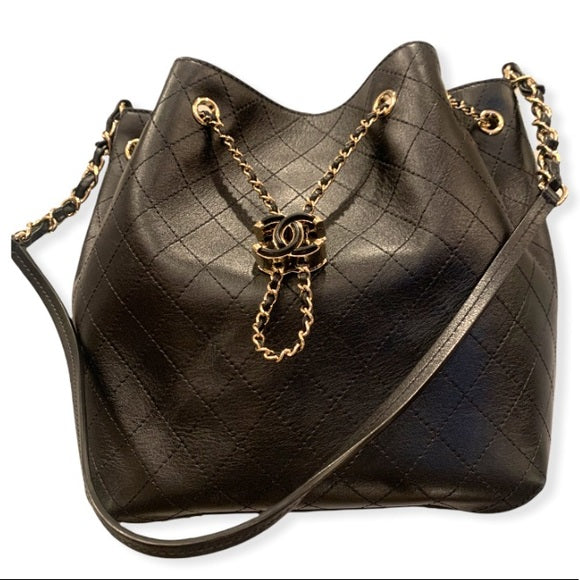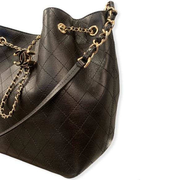 CHANEL Calfskin Stitched Drawstring Bag -Crafted of diamond-stitched calfskin leather -Colour: Black -Leather threaded polished light gold chain shoulder strap The leather threaded chain conch-cord opens to a black fabric interior.