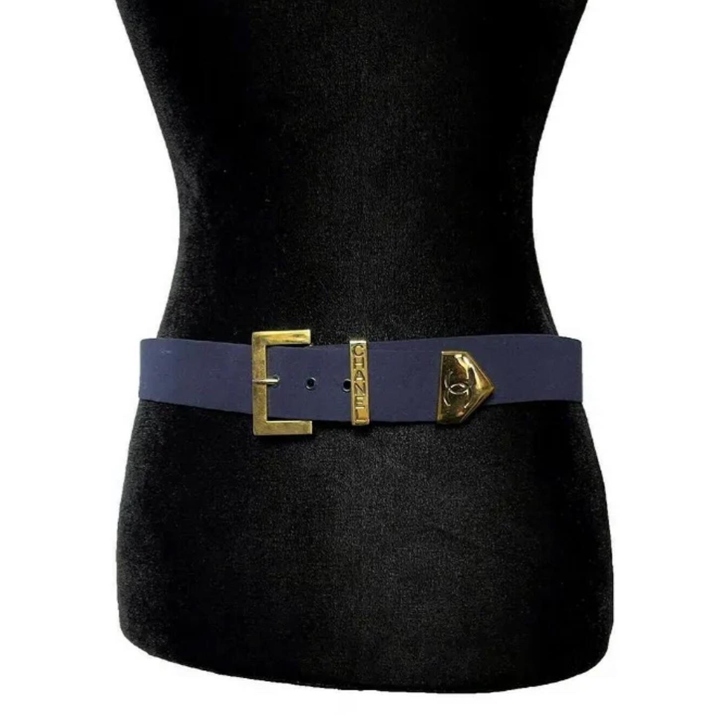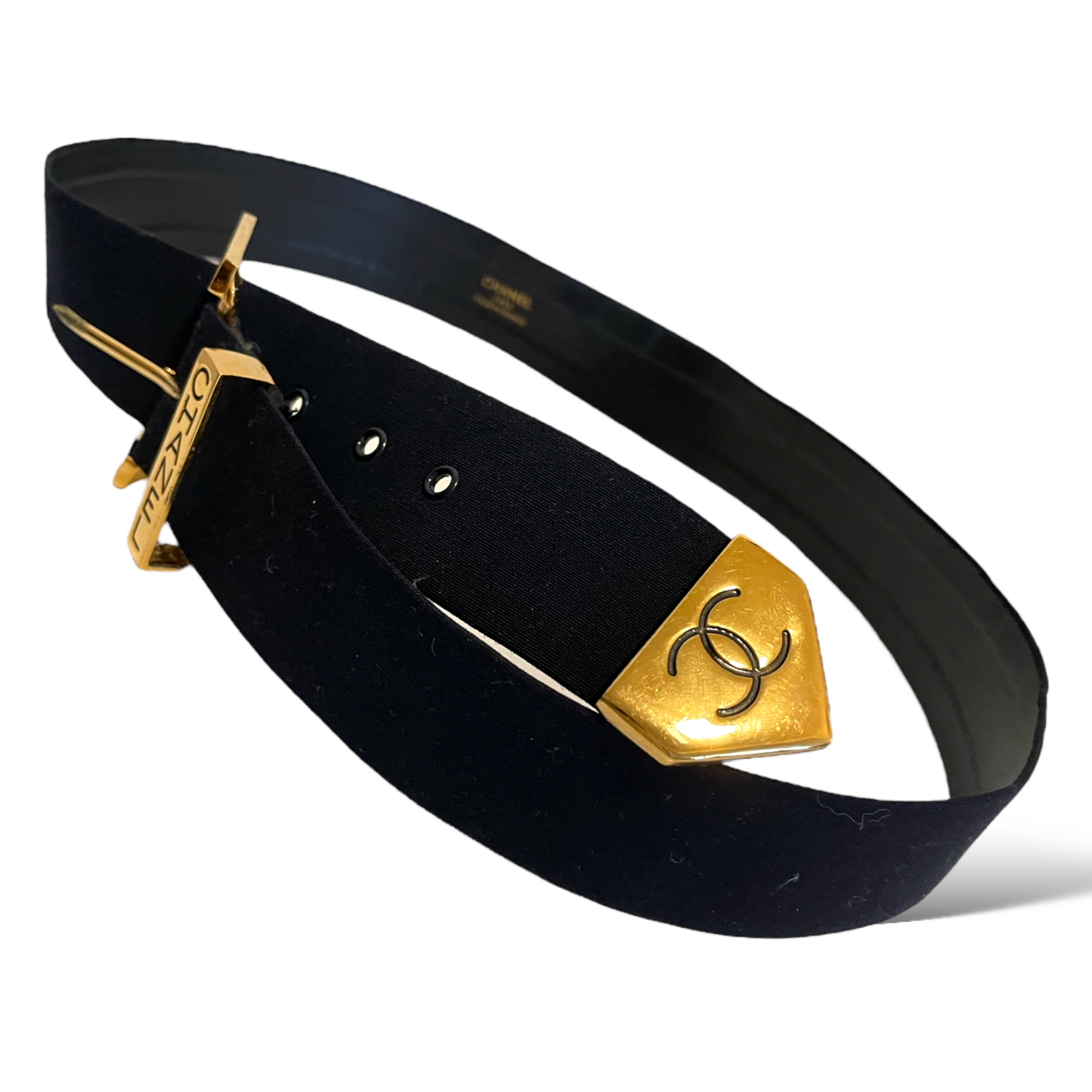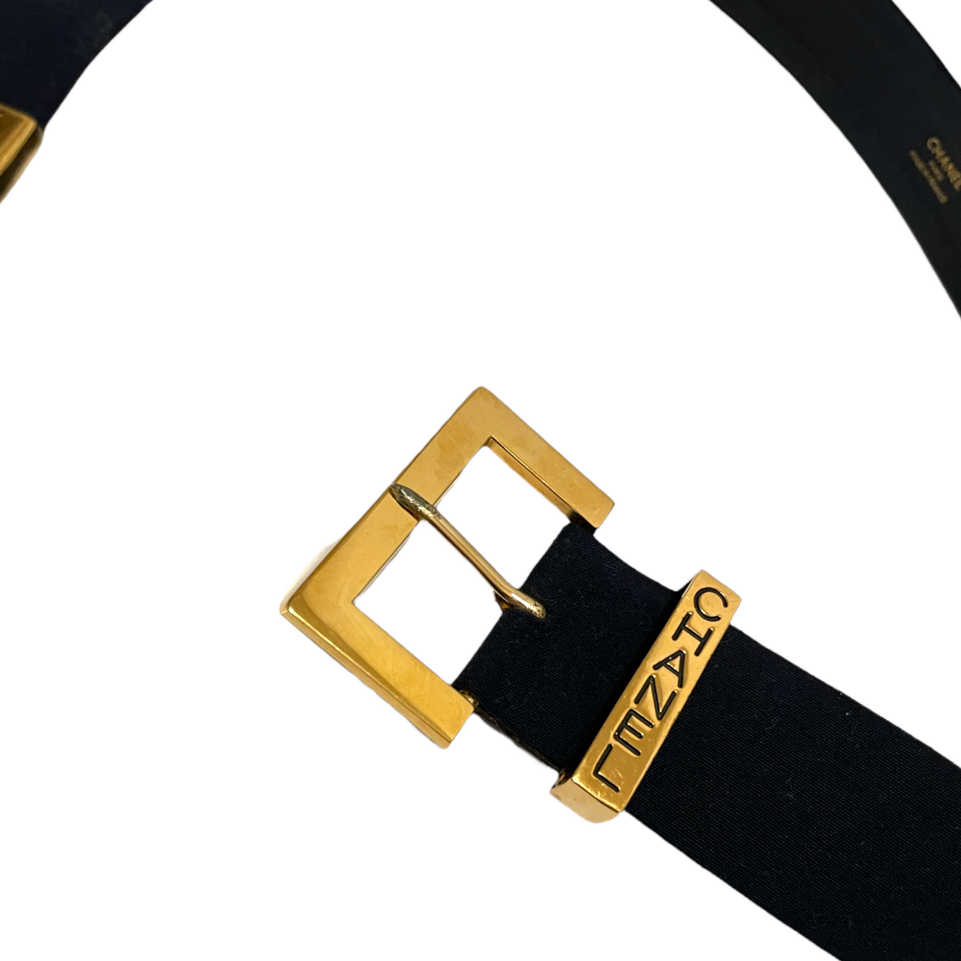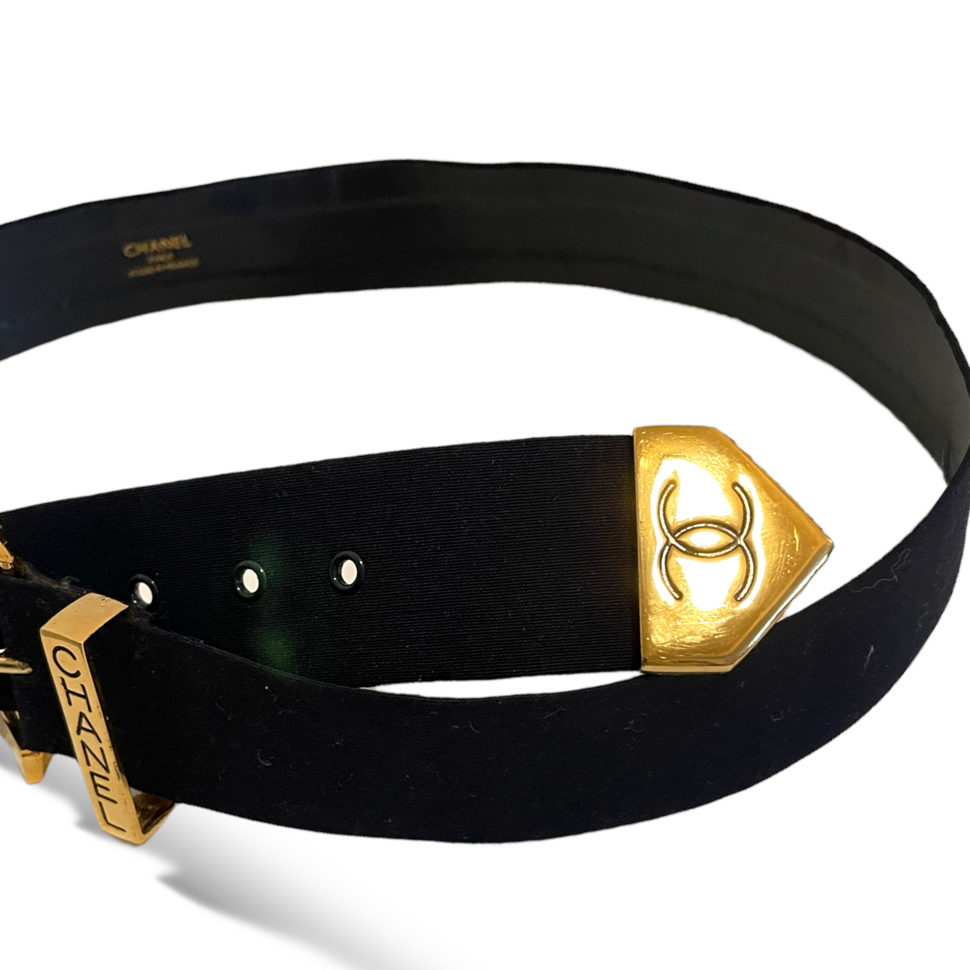 From CHANEL’s Spring 1999 Collection, this belt is stamped CHANEL (buckle) & the interlocking CC Logo (end) on the gold-tone hardware.