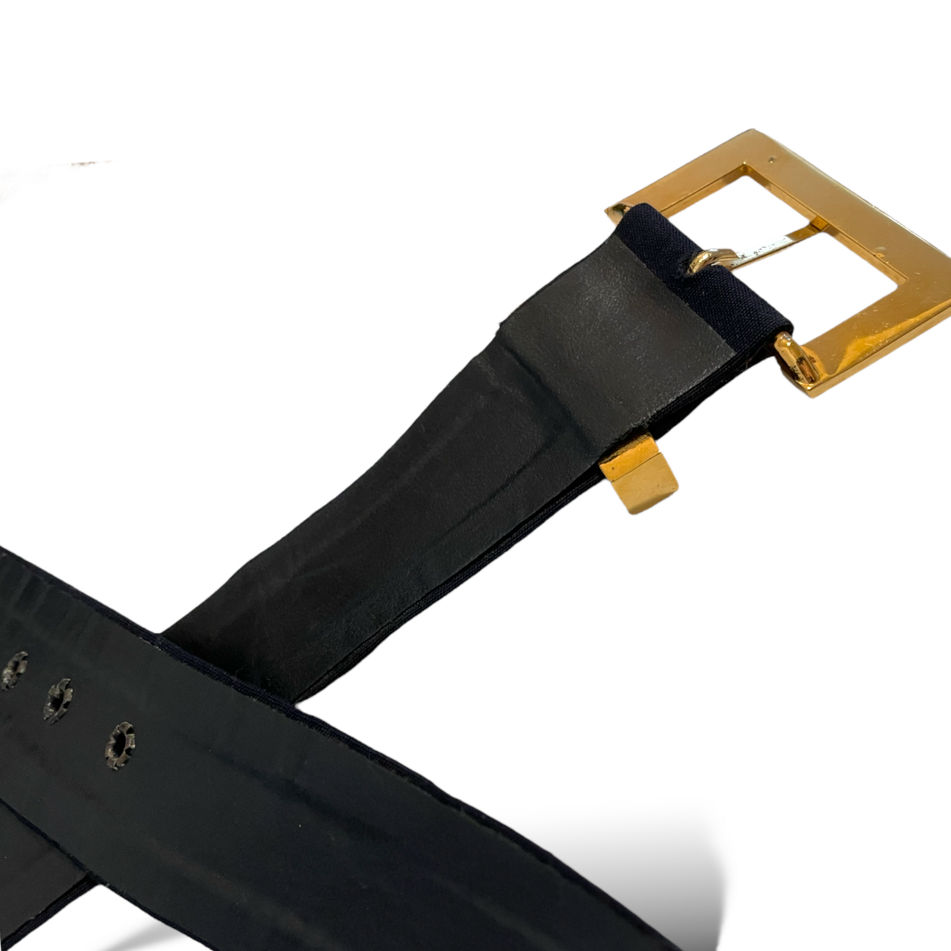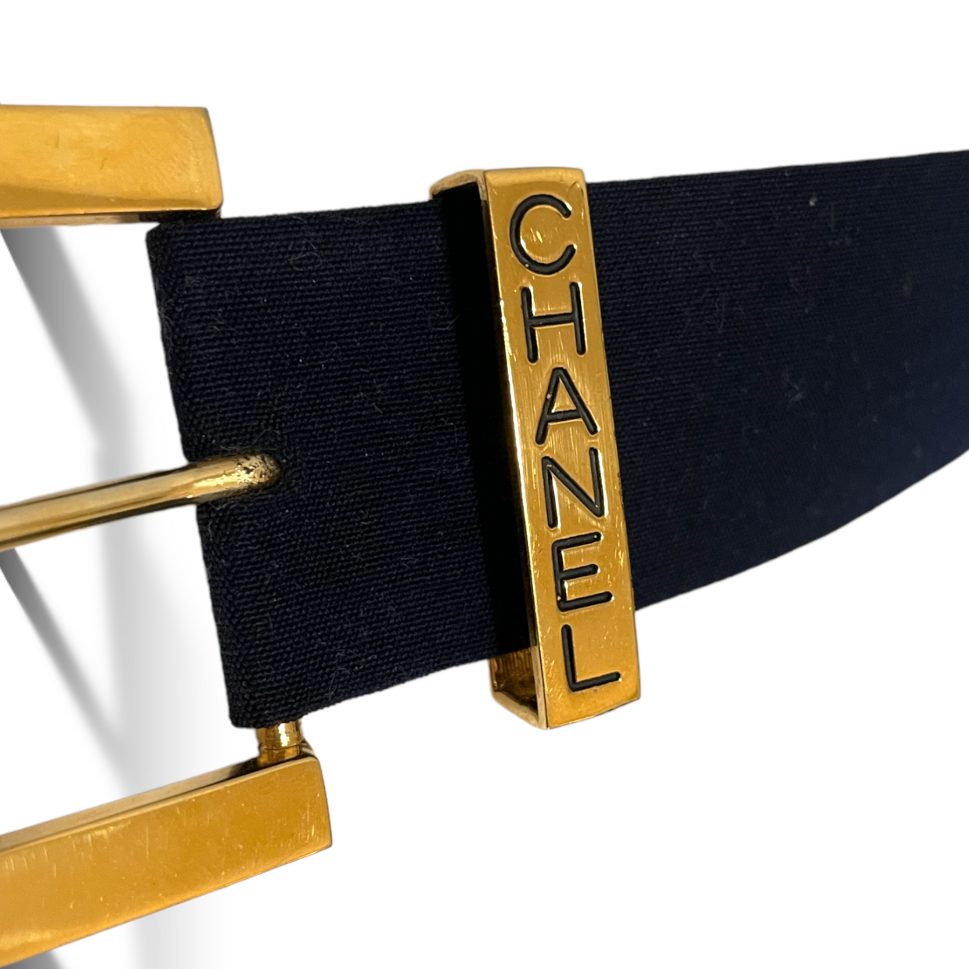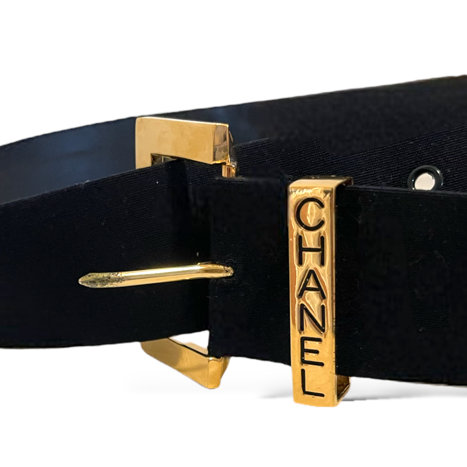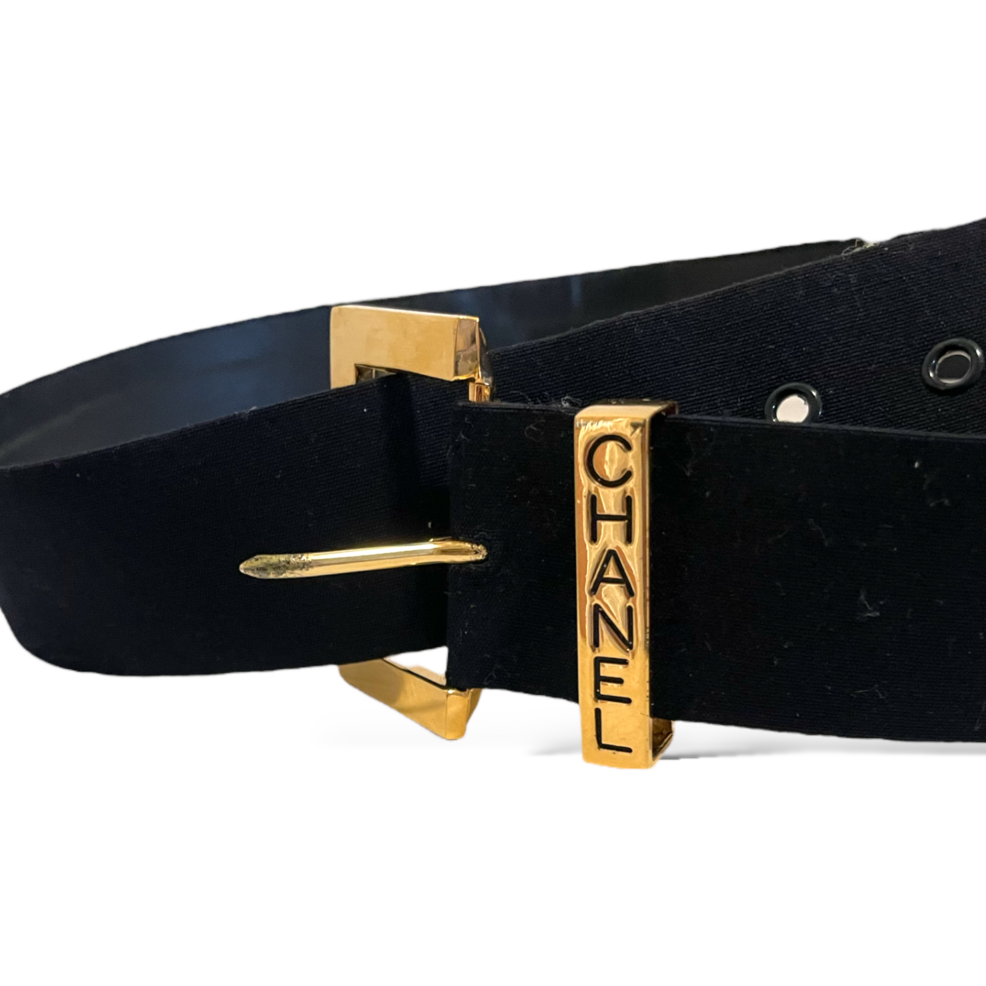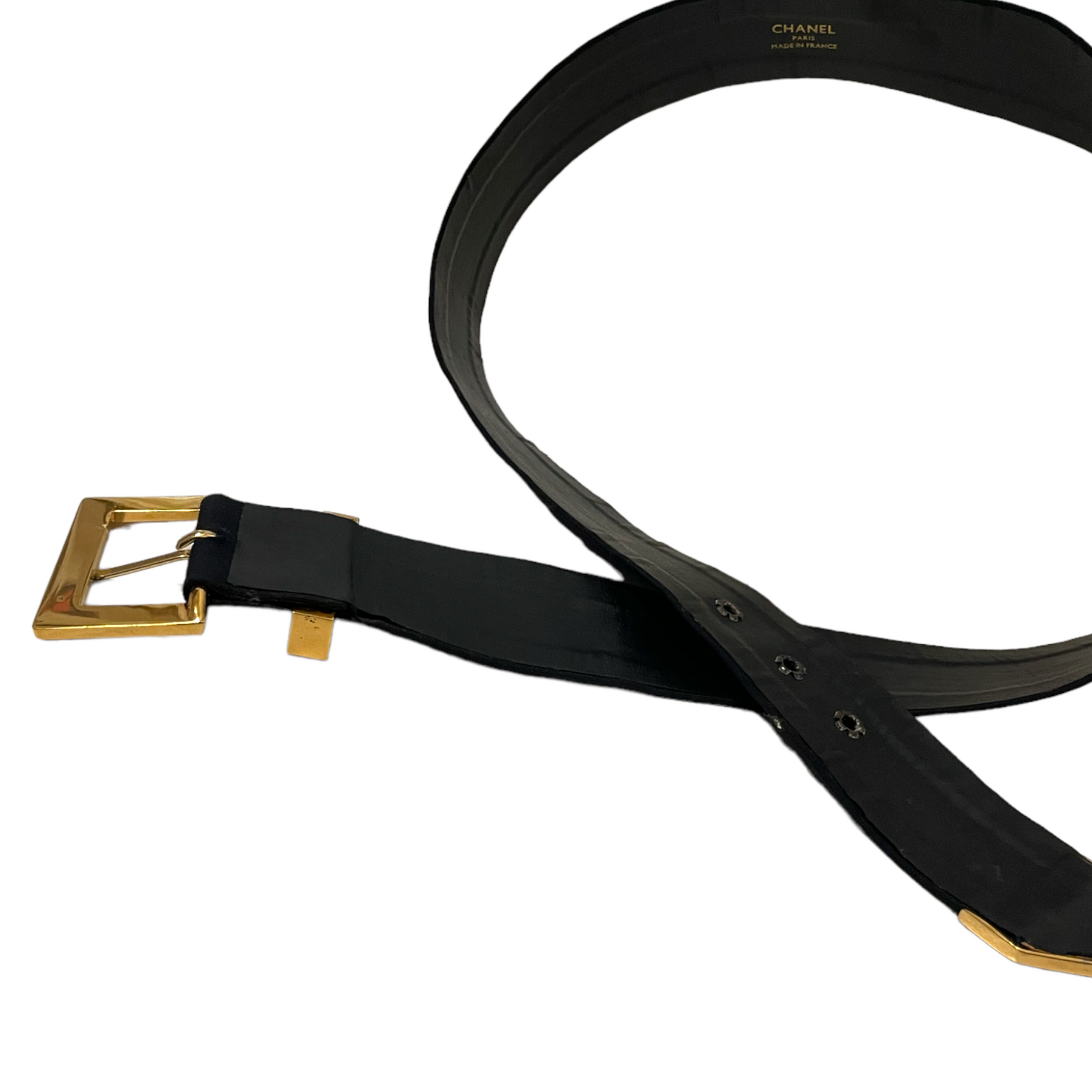 From CHANEL’s Spring 1999 Collection, this belt is stamped CHANEL (buckle) & the interlocking CC Logo (end) on the gold-tone hardware.