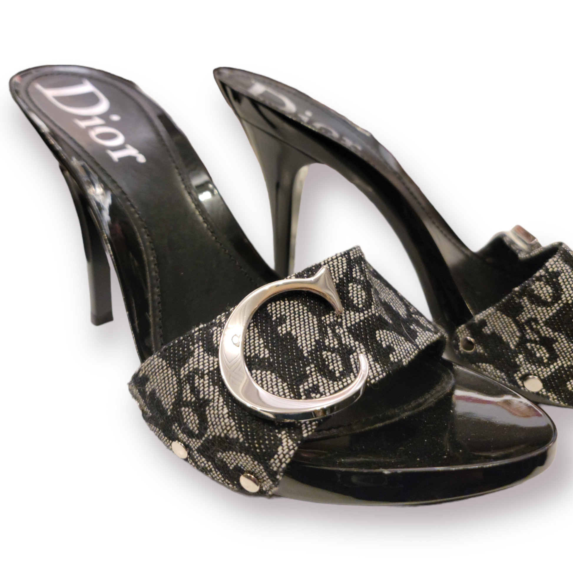 CHRISTIAN DIOR Monogram Trotter Mule Heels with Large Silver Toned C & D Detail