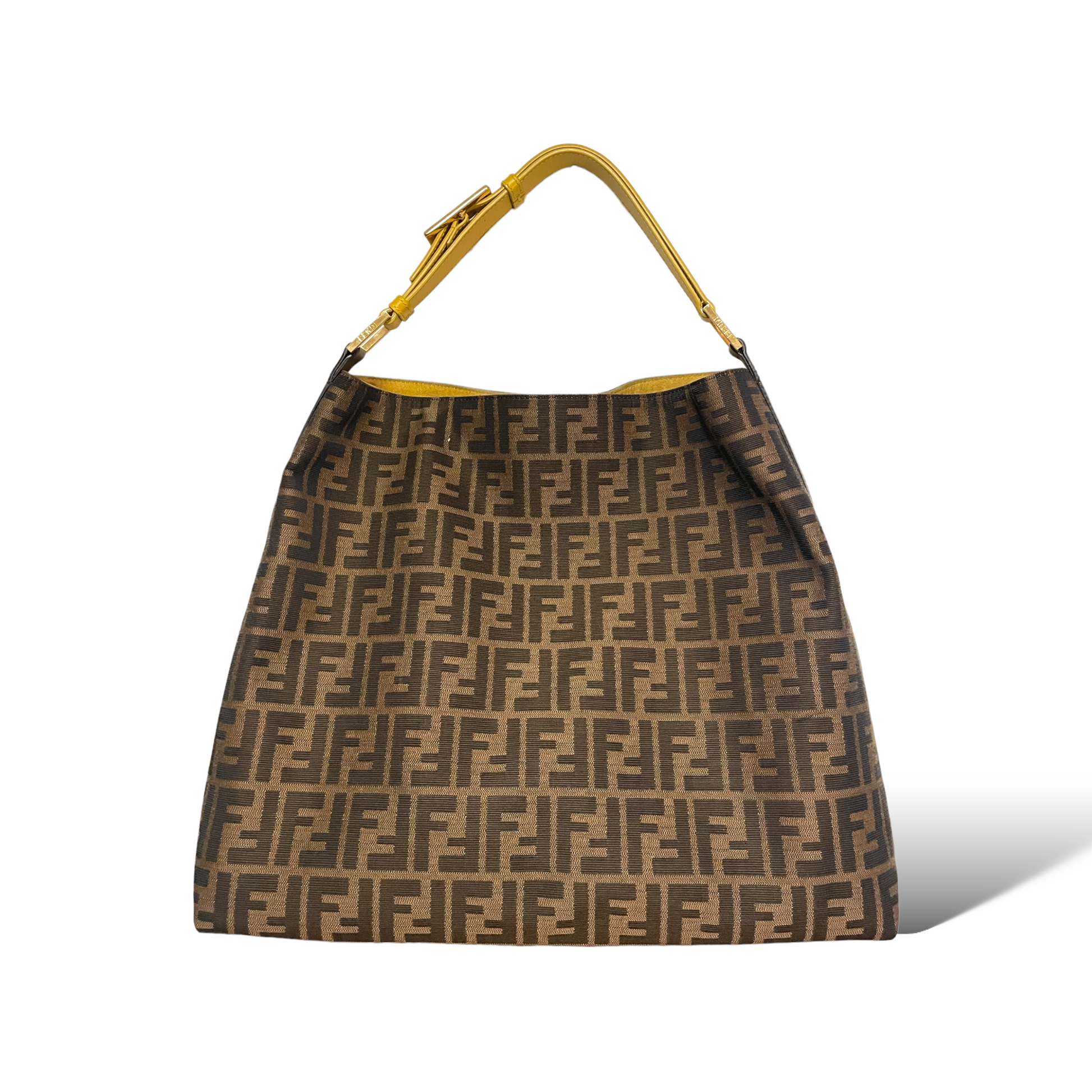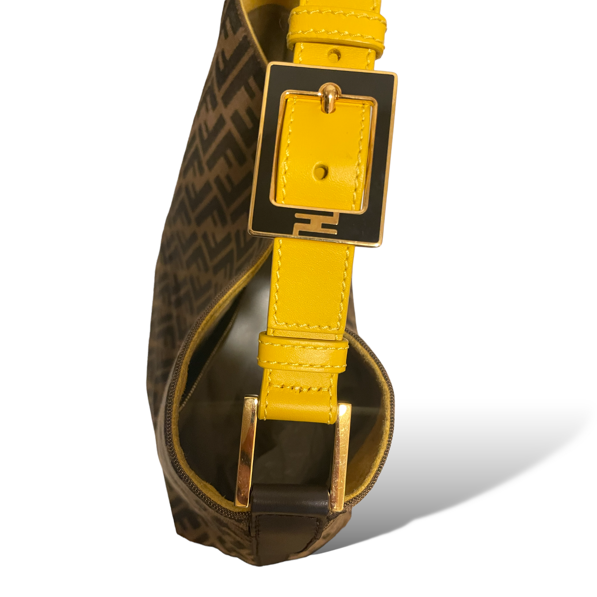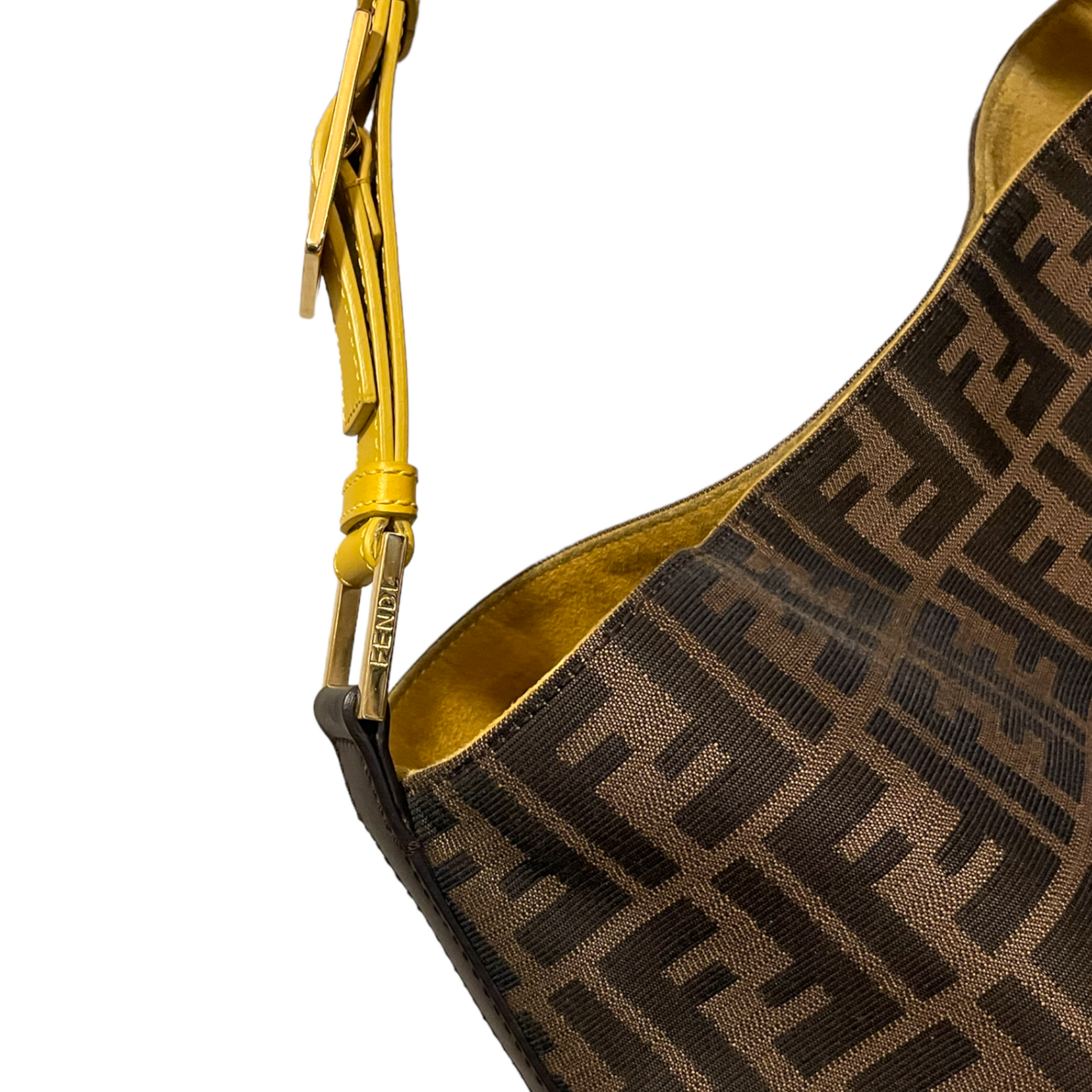 Who doesn't love the go-to ease of a hobo? Fendi gets it right with iconic Zucca and a handsome buckled yellow shoulder strap.