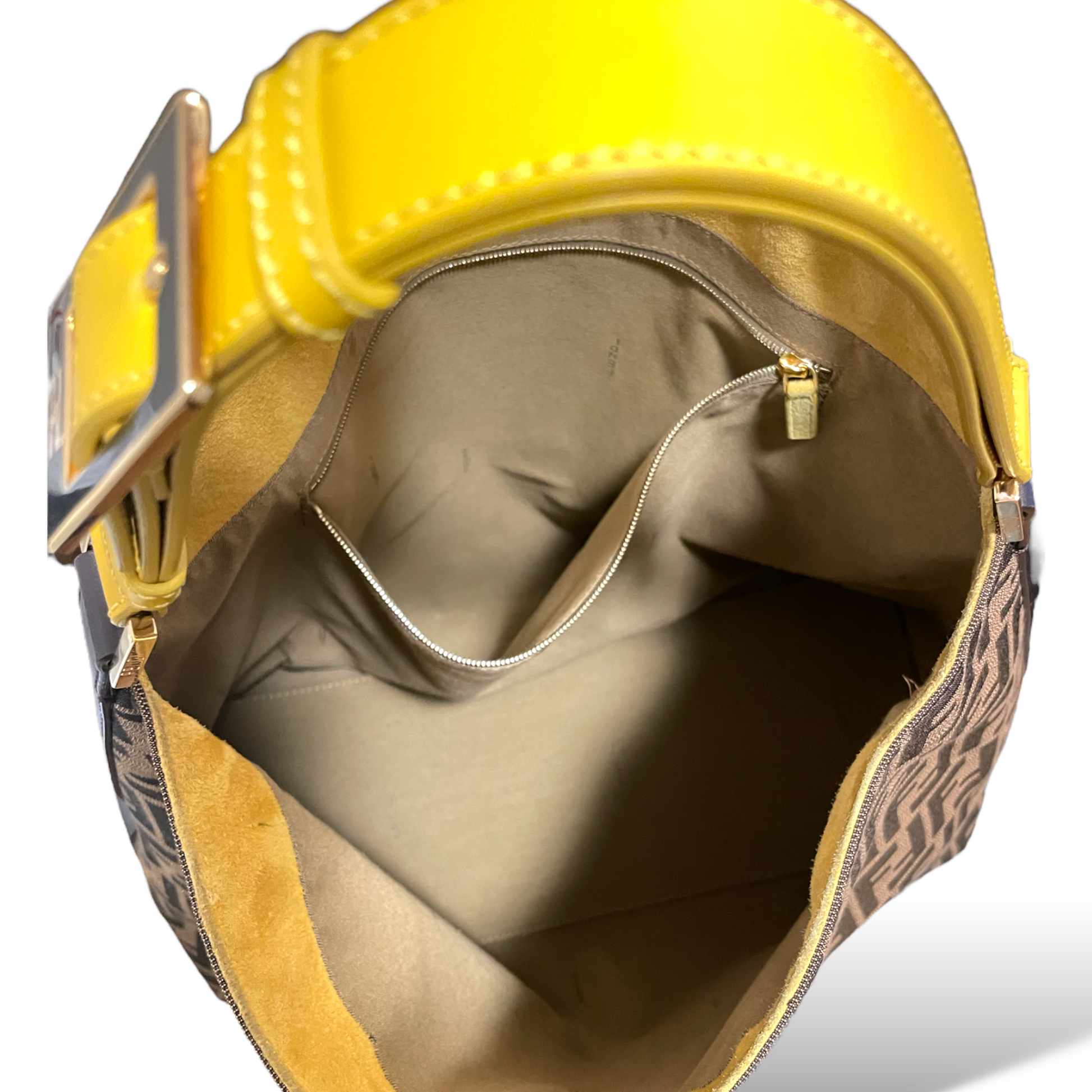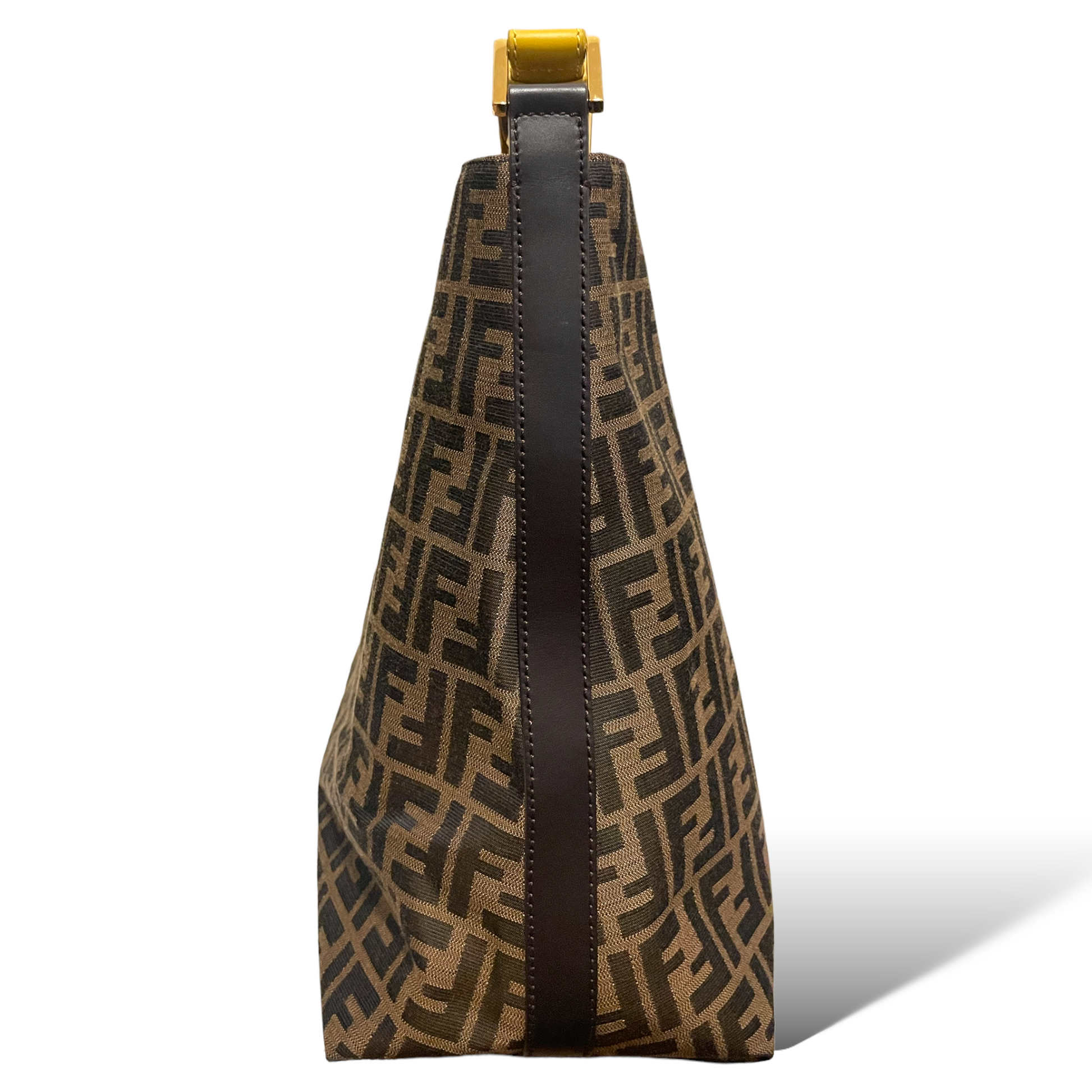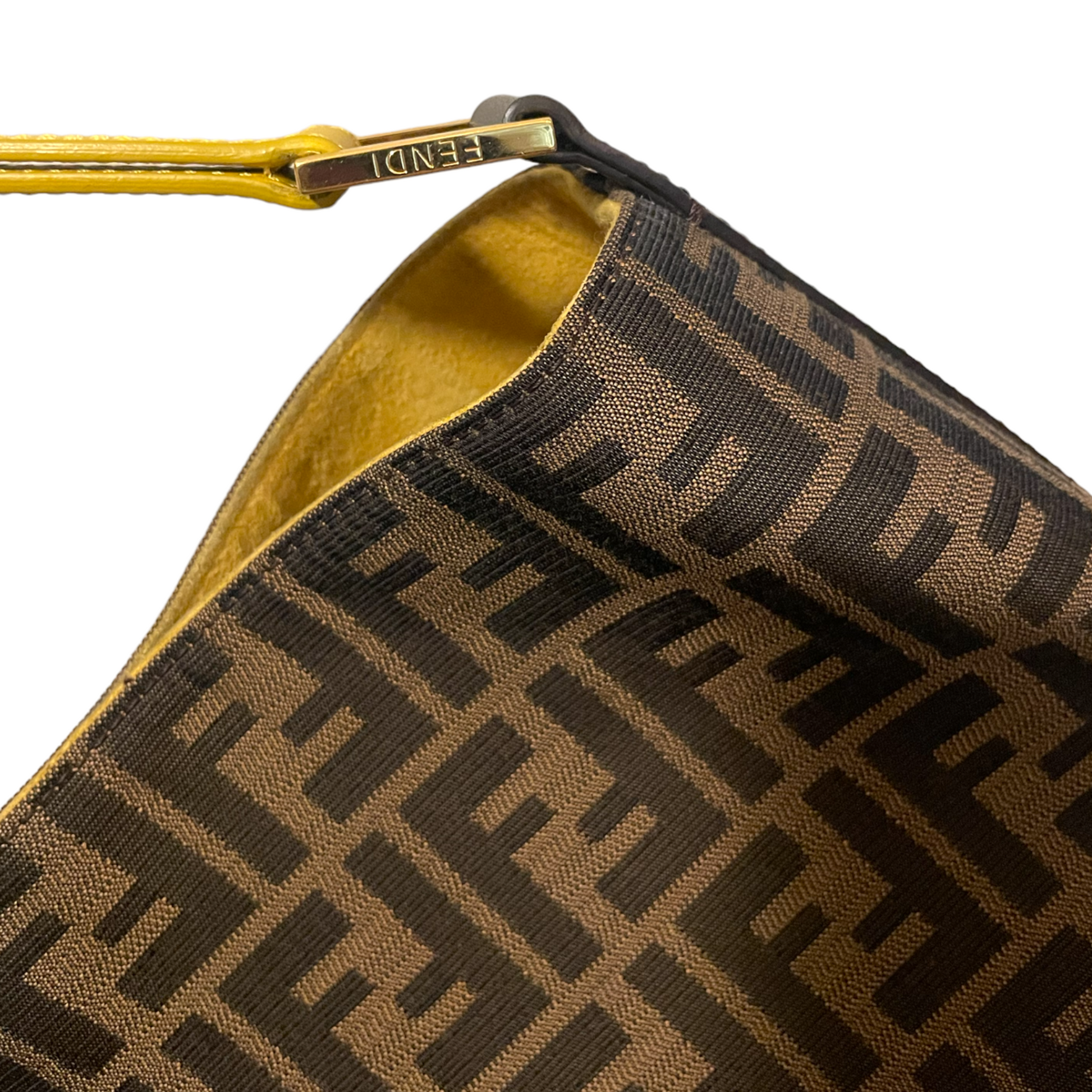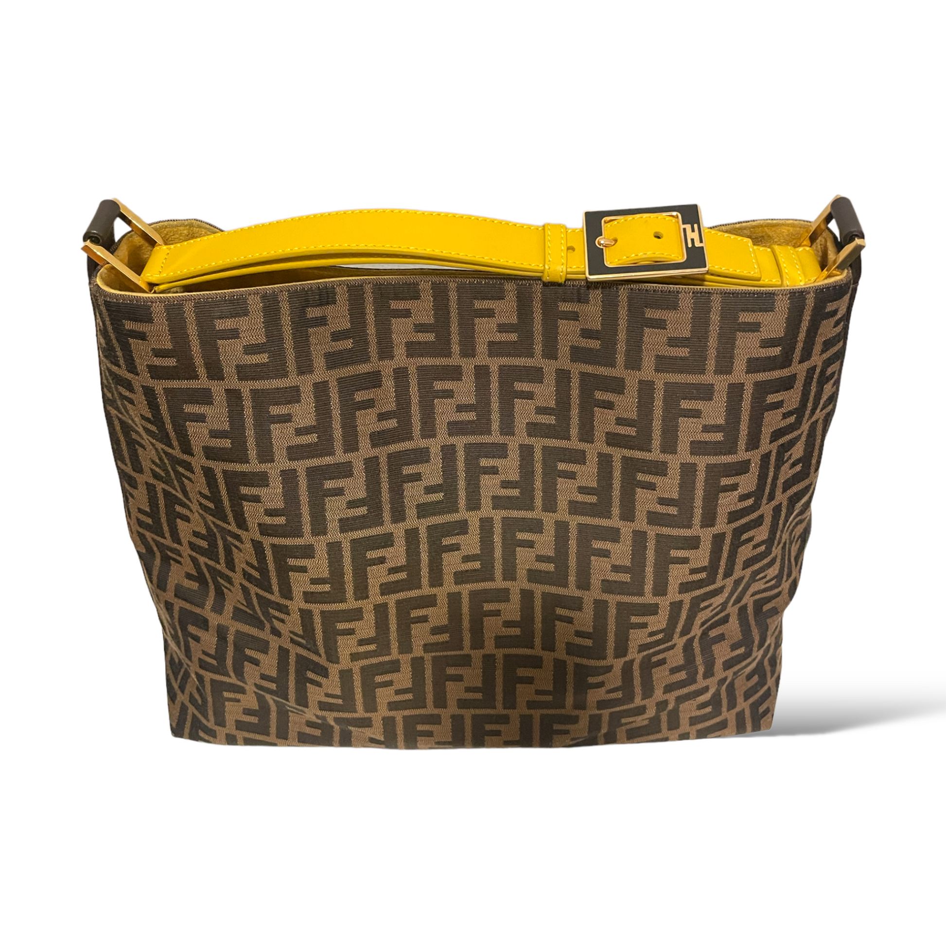 Who doesn't love the go-to ease of a hobo? Fendi gets it right with iconic Zucca and a handsome buckled yellow shoulder strap.
