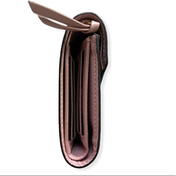 Crafted of traditional Louis Vuitton monogram coated canvas. The wallet features: -pink leather snap closure -Opens to a matching pink cross-grain leather interior with -6 card slots, patch pockets, a billfold, and a zipper compartment MEASUREMENTS: Length: 4.75 in Height: 3.5 in Width: 1 in Designer ID#: MI5127 Comes with: Dust Bag & Box