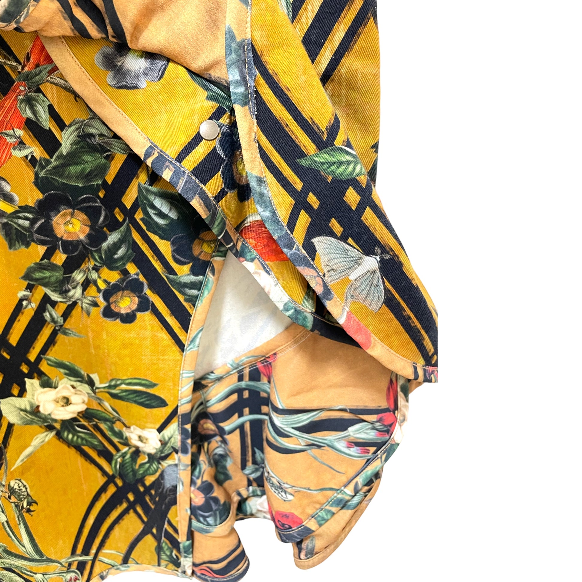 Keep an eye-catching look all summer long with this fun floral print and playful ruffle embellished slit accented front.