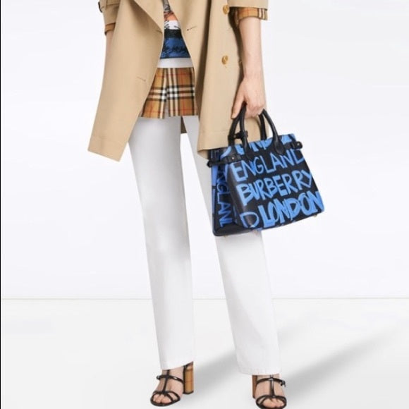 A RARE FIND, this LIMITED EDITION Medium Burberry Banner in Graffiti Print is a beautifully structured tote in leather with a bold graffitied logo print, framed with equestrian-inspired accents. -Made in Italy Composition- Outer: Calf Leather 100%, Metal 100% Lining: Cotton 100% Condition: excellent *Please look closely at photos of bags * MEASUREMENTS: Width- 13.4“ Height- 9.8 in (14” with Handle) Depth- 6.3” -Adjustable Strap: 35.8”