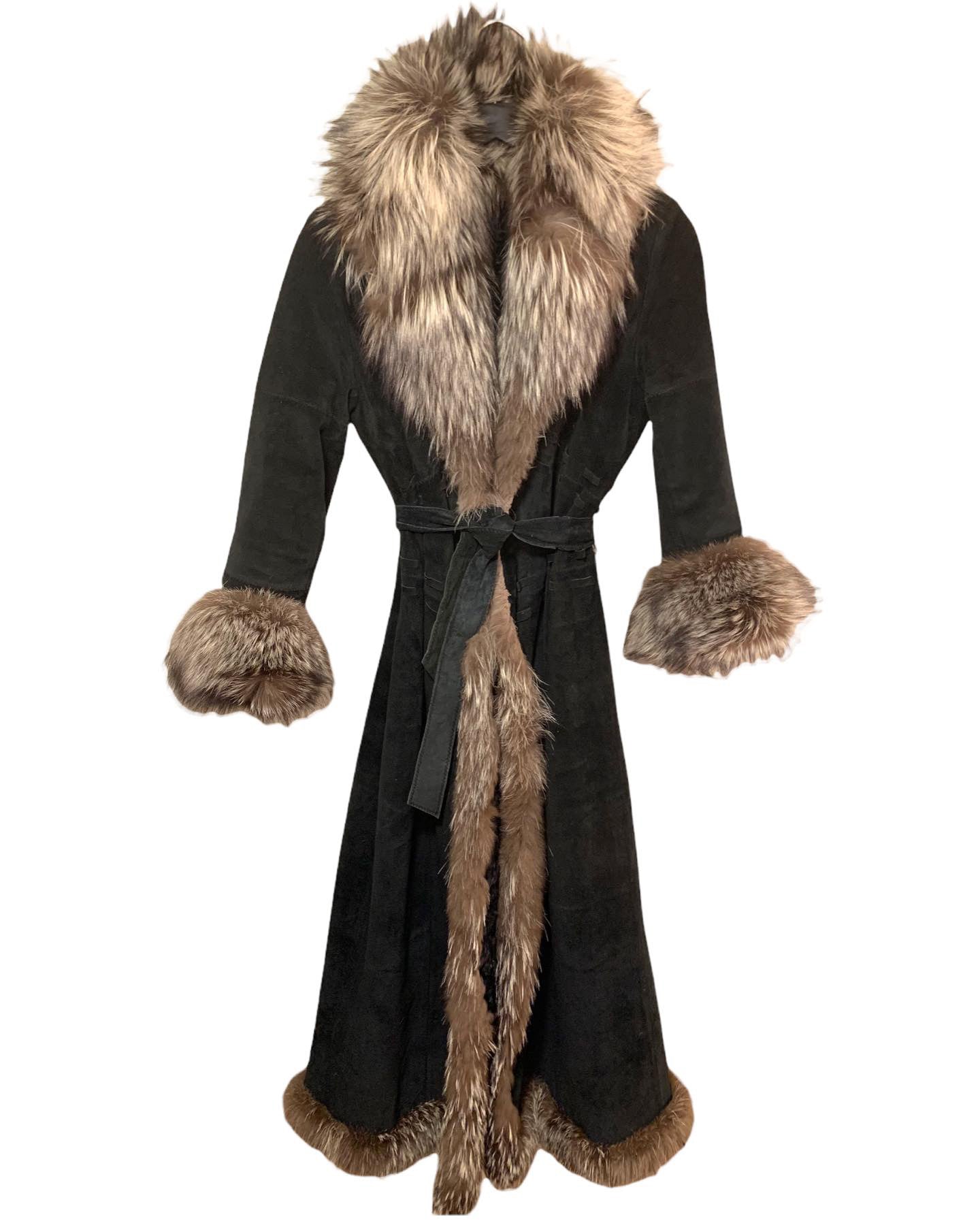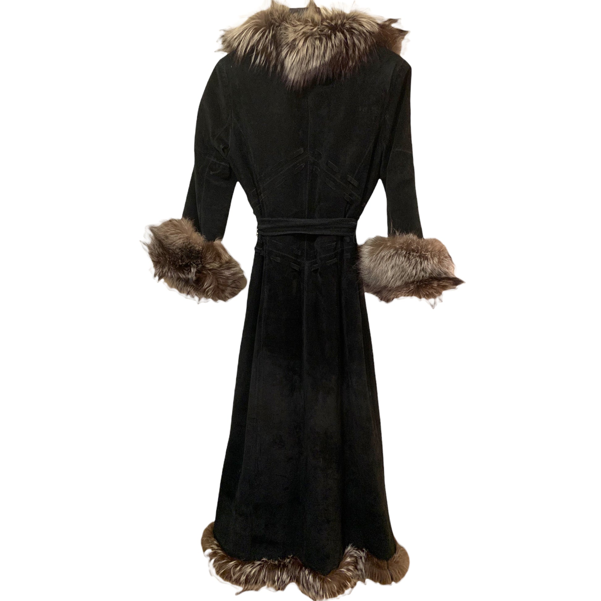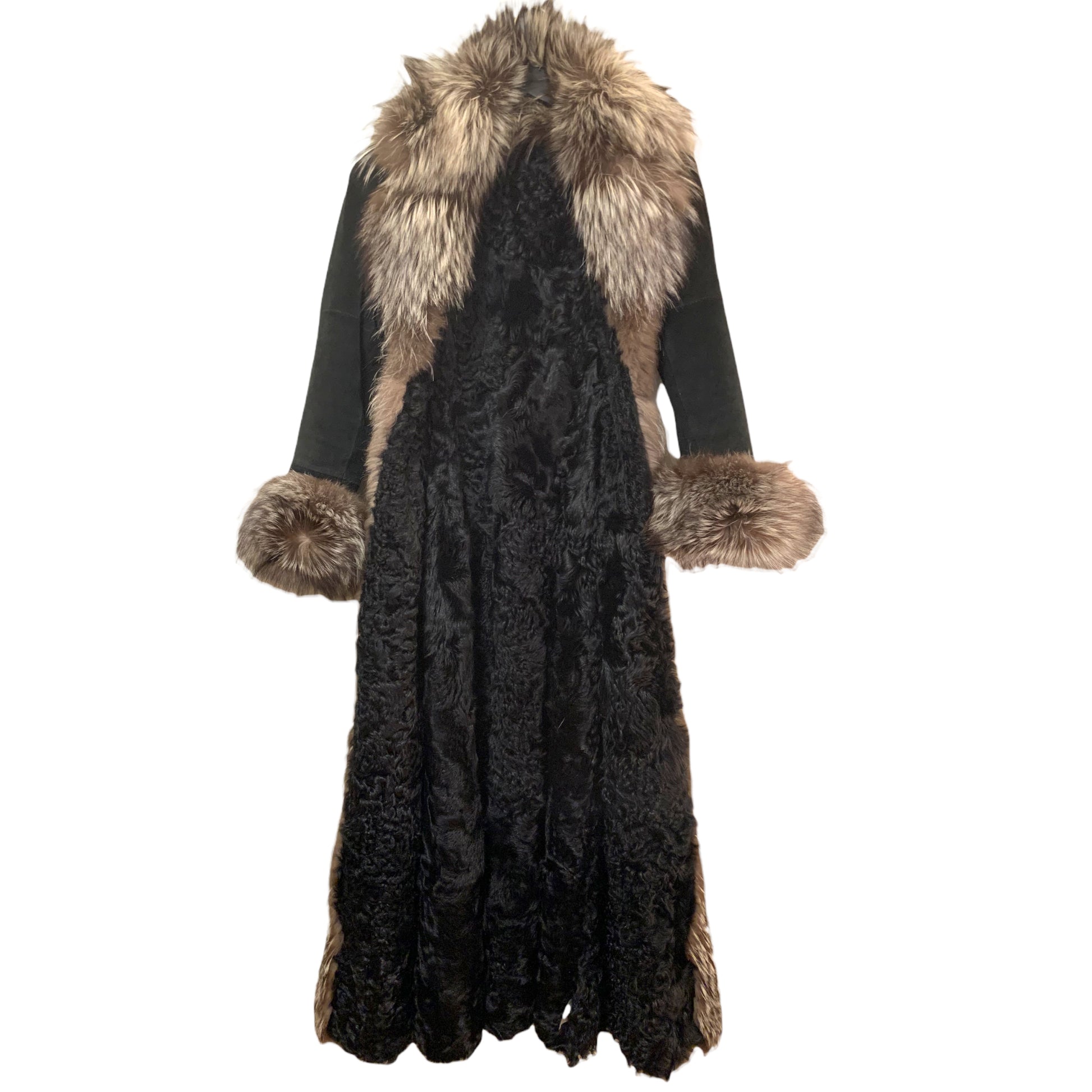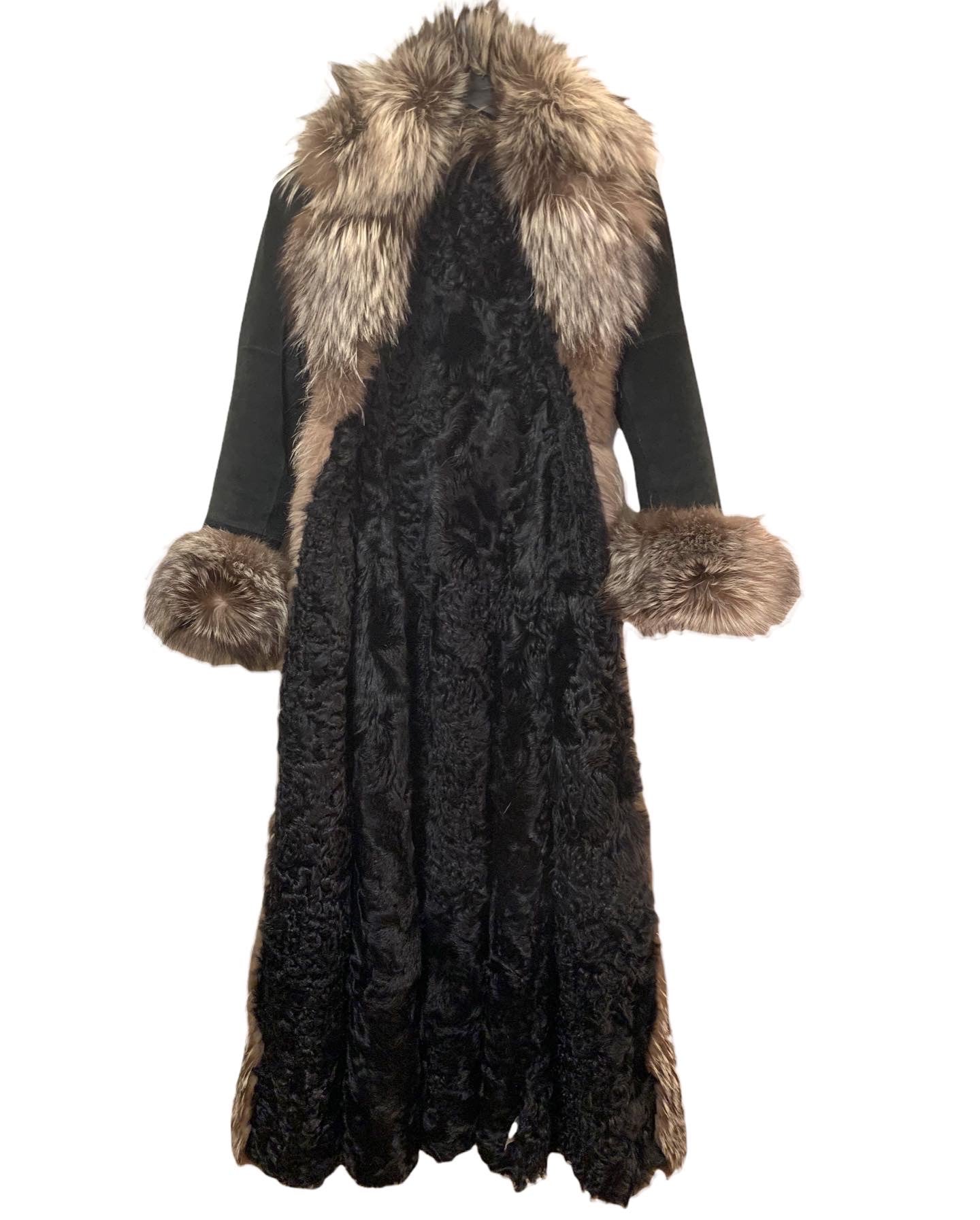 ST. JOHN Suede, Dyed Broadtail Persian Lamb & Silver Fox Fur Trim Long Coat