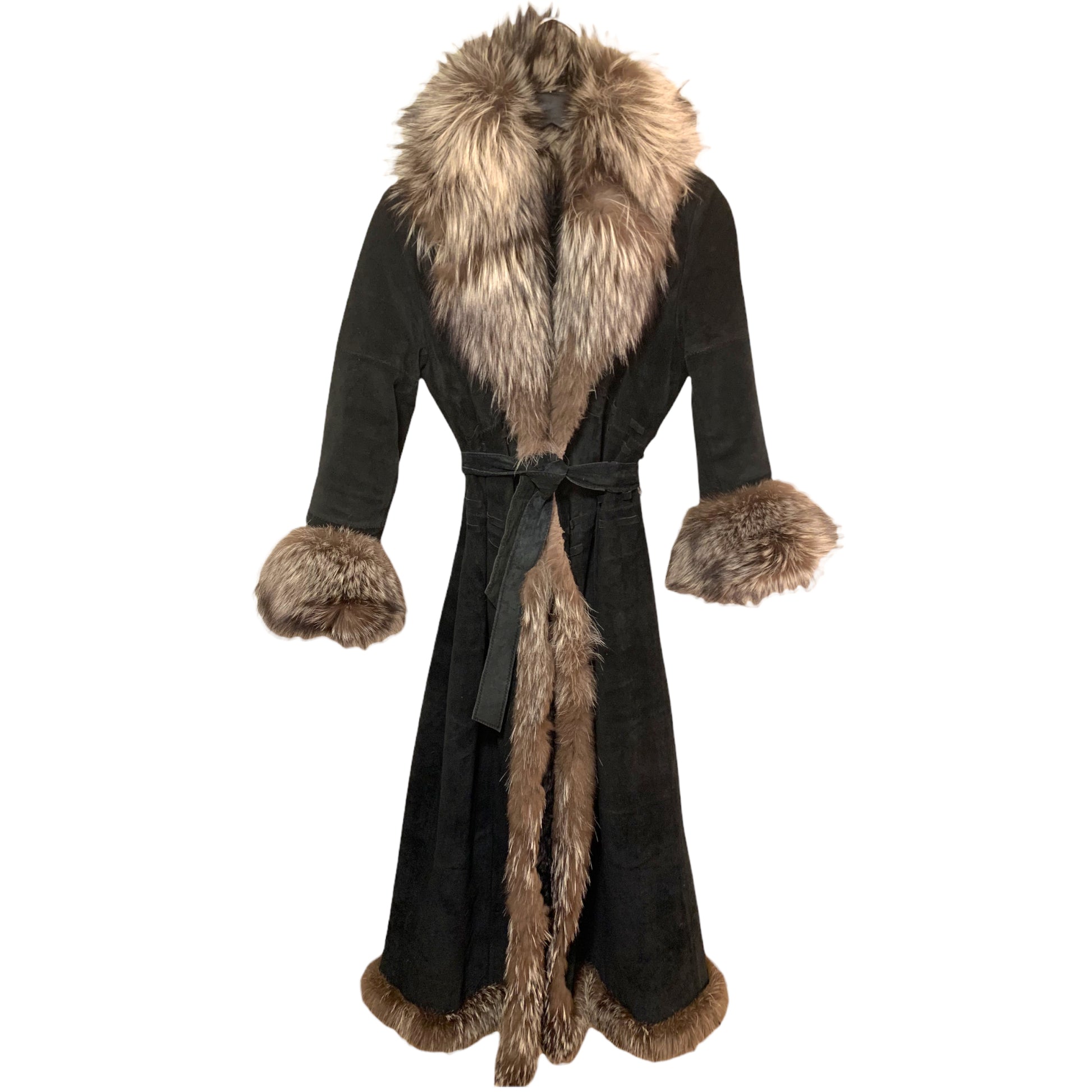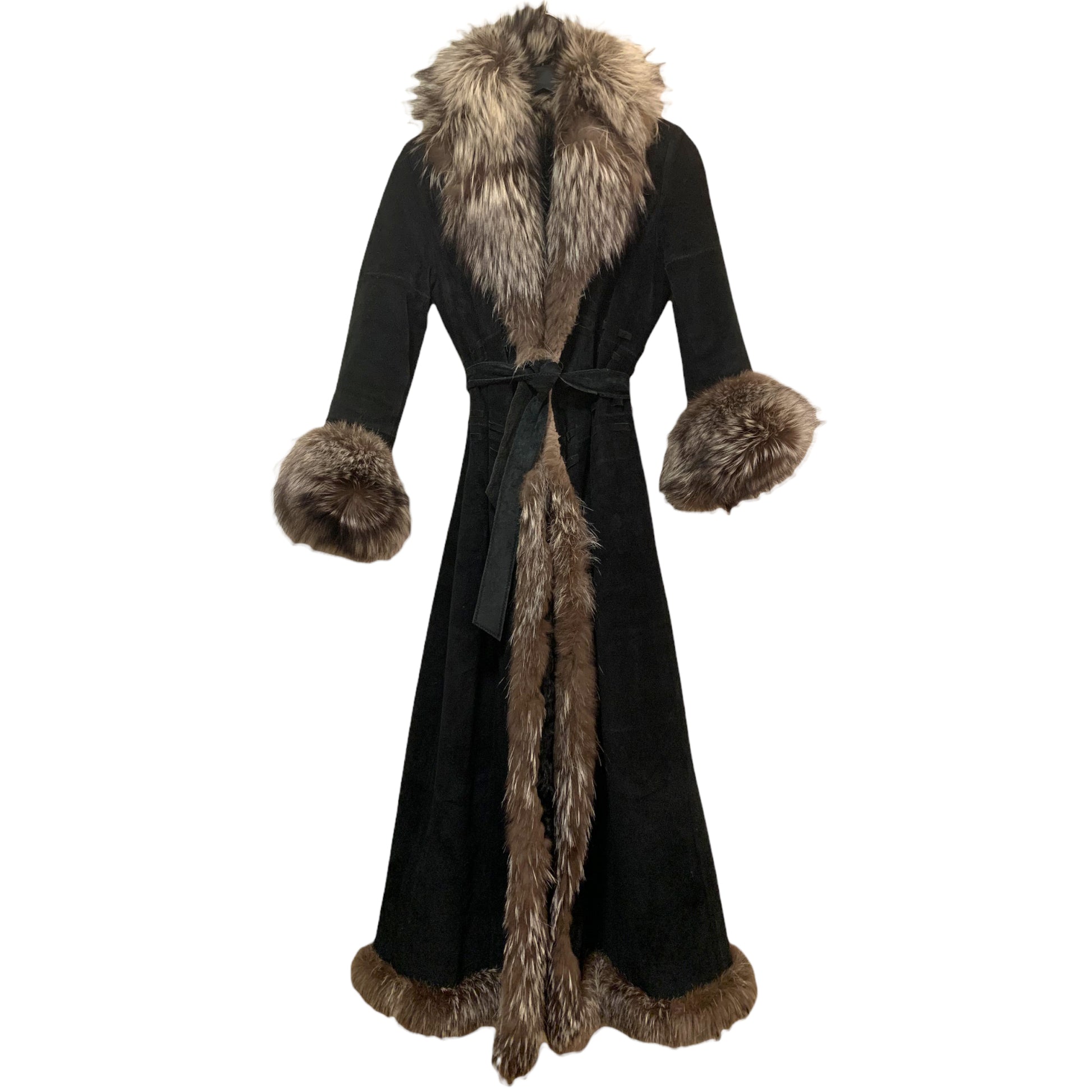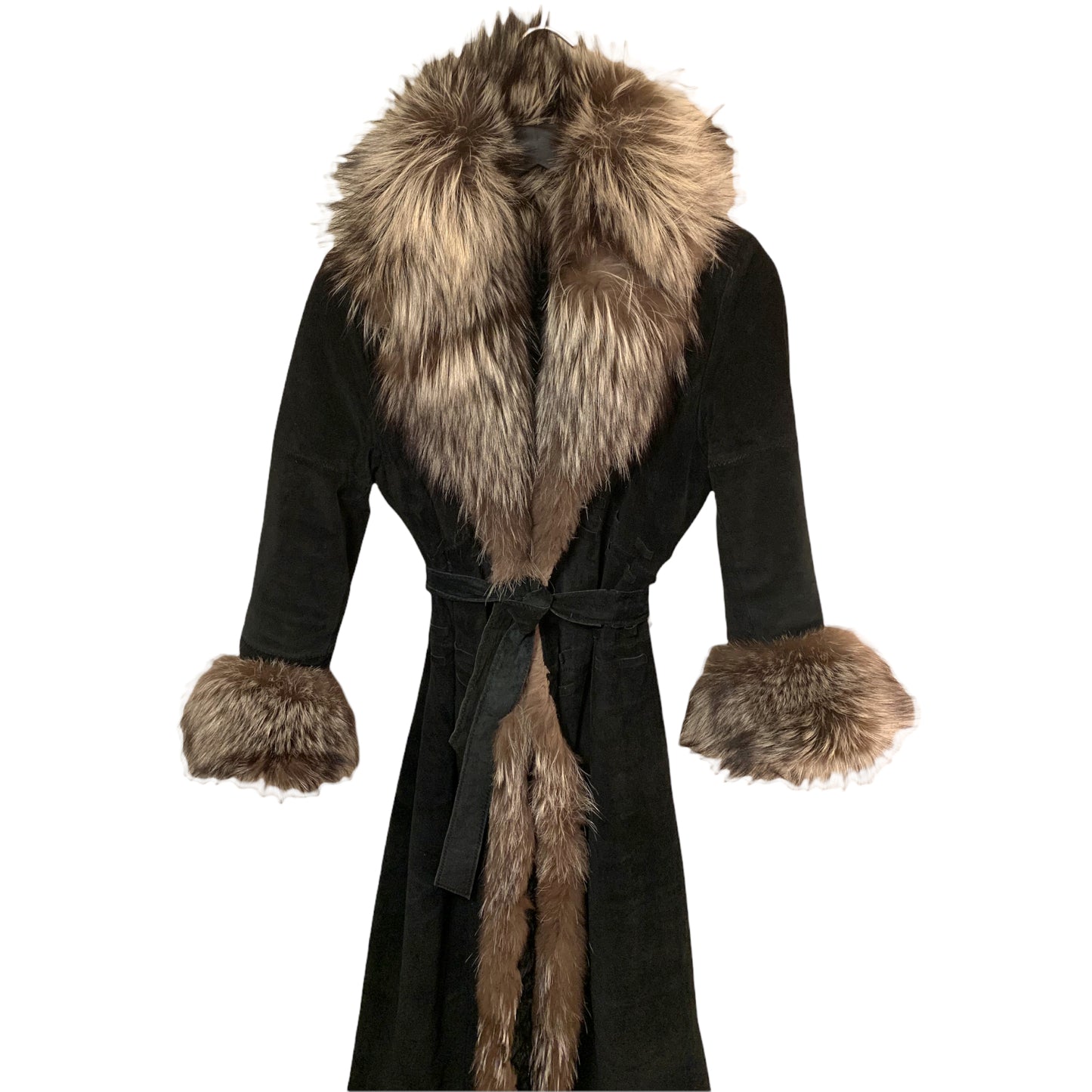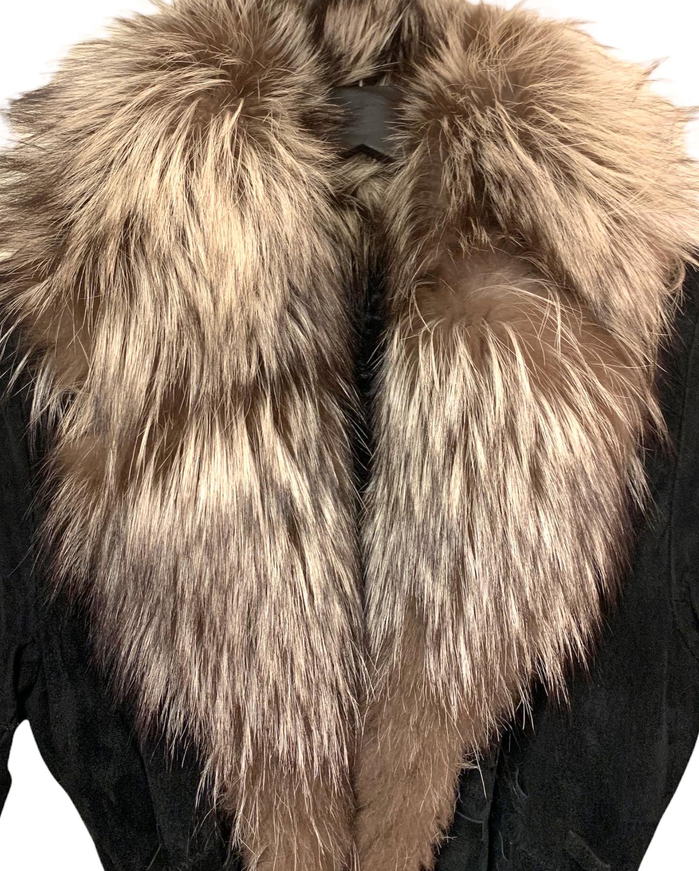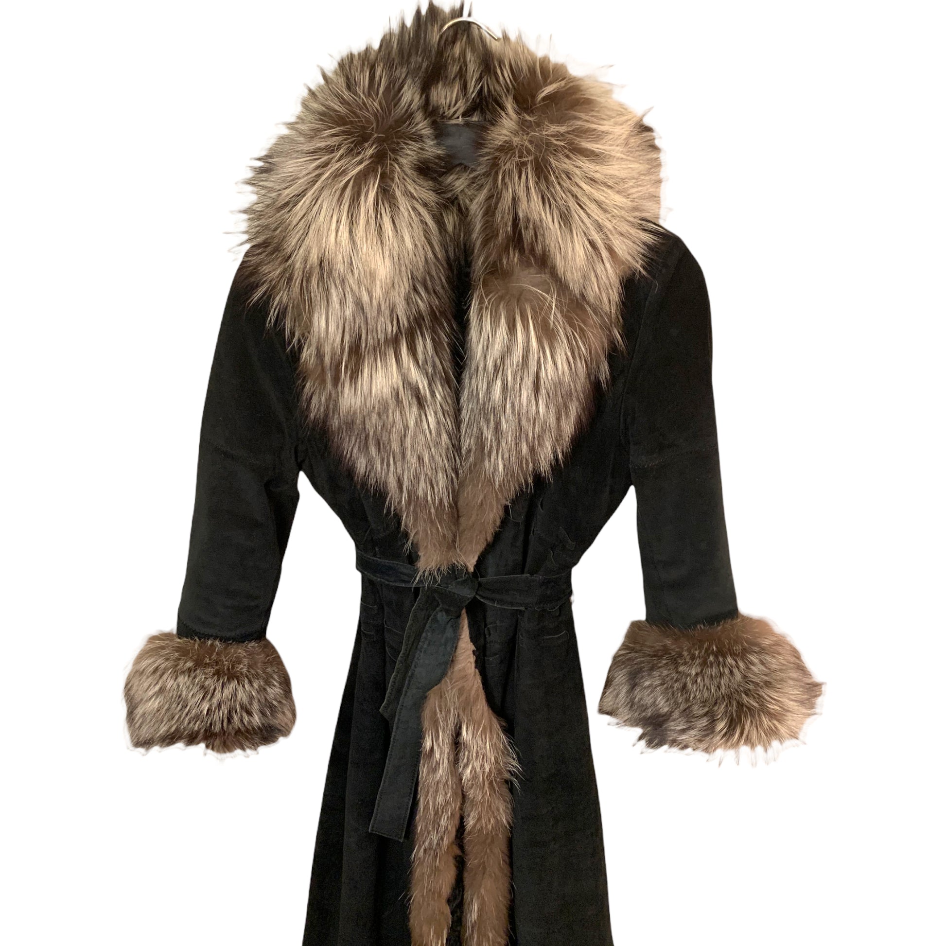 ST. JOHN Suede, Dyed Broadtail Persian Lamb & Silver Fox Fur Trim Long Coat
