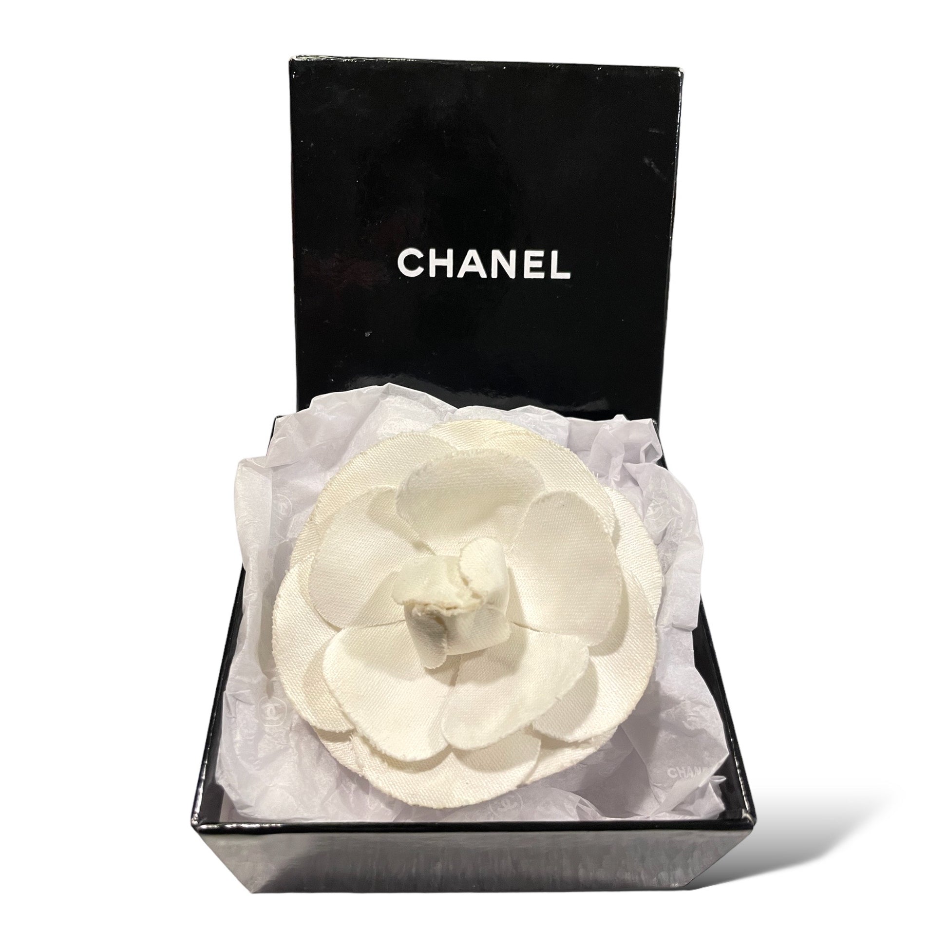 This is a collectible ORIGINAL AUTHENTIC white Chanel Camellia silk flower pin. I absolutely adore seeing this rare Vintage camellia brooch worn on lapels of well tailored blazer jackets, or dressing up a little black dress. It can even be pinned to a handbag! This beautiful brooch comes with its original Black Chanel box, Chanel tissue paper & a hand written Label on the boxes exterior.