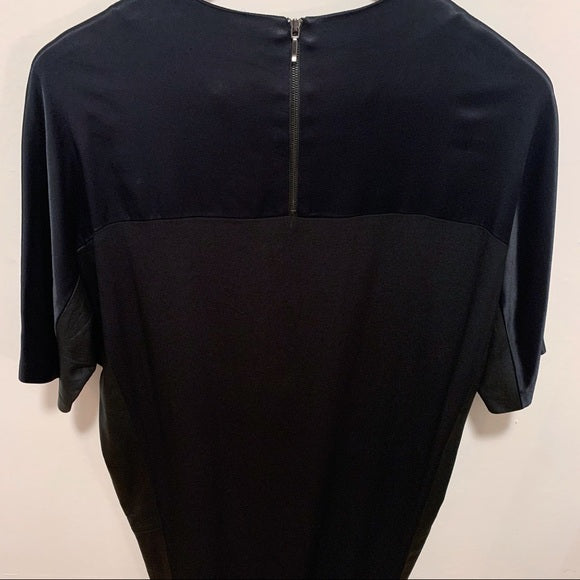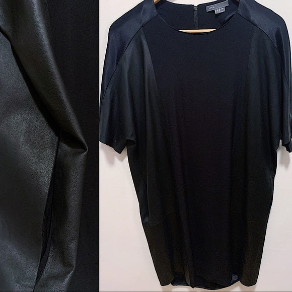 VINCE Crew Neck Mini Dress Size: S Condition: New without Tags, Never worn. DESCRIPTION : Vince Shift Dress -Color: Black Leather Trim Embellishment Short Sleeve with Crew Neck Exposed Zip Closure at Back -Size Guide: Bust: 46" Waist: 42" Hip: 41" Length: 35" -Fabric: 99% Viscose, 1% Elastane; Combo 100% Leather